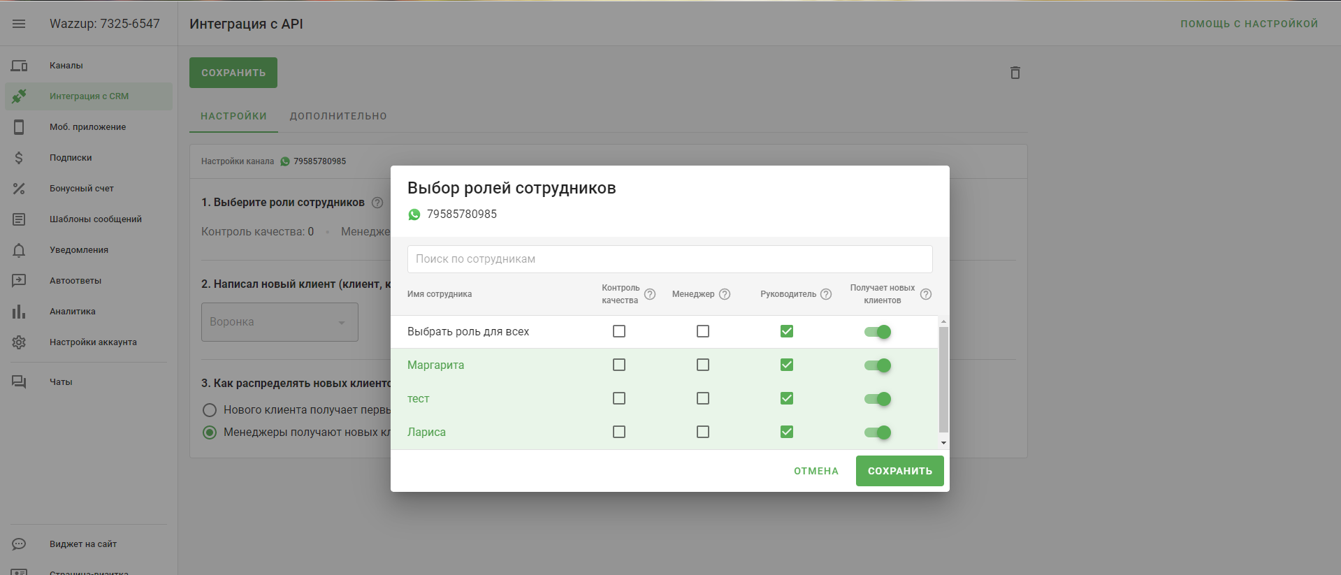 Для корректной работы необходимо указать роли сотрудников в Wazzup.