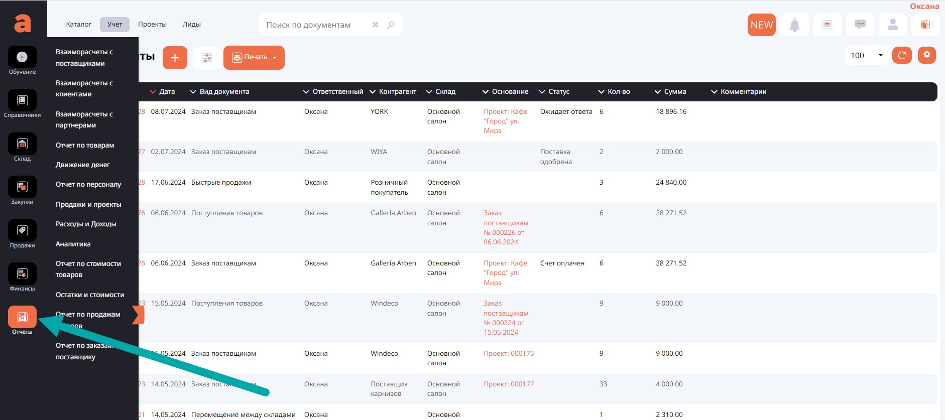Важным разделом является блок Отчёты, в котором вы можете проанализировать свою деятельность в разрезе поставщика, клиента, получить полный отчёт по товарам, проанализировать свои расходы и доходы, посмотреть насколько успешны ваши проекты.