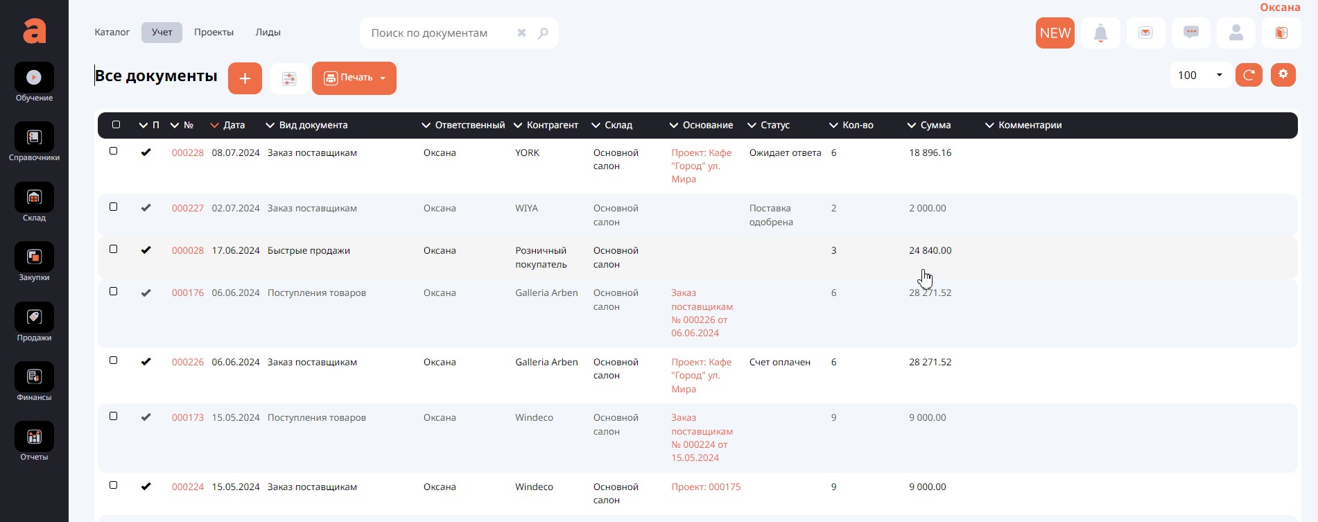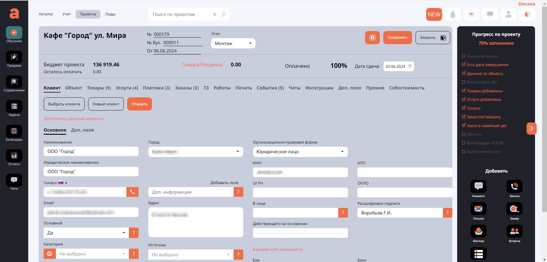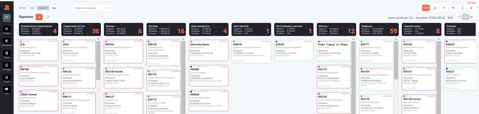 А также вести учёт платежей от клиентов, платежей поставщикам, формировать заказы товаров, вести документацию для клиента, ставить задачи по выполнению проекта и вести контроль. А также организовывать общение в чате с сотрудниками внутри самого проекта, а при настройке интеграции с различными мессенджерами - общение с клиентами.