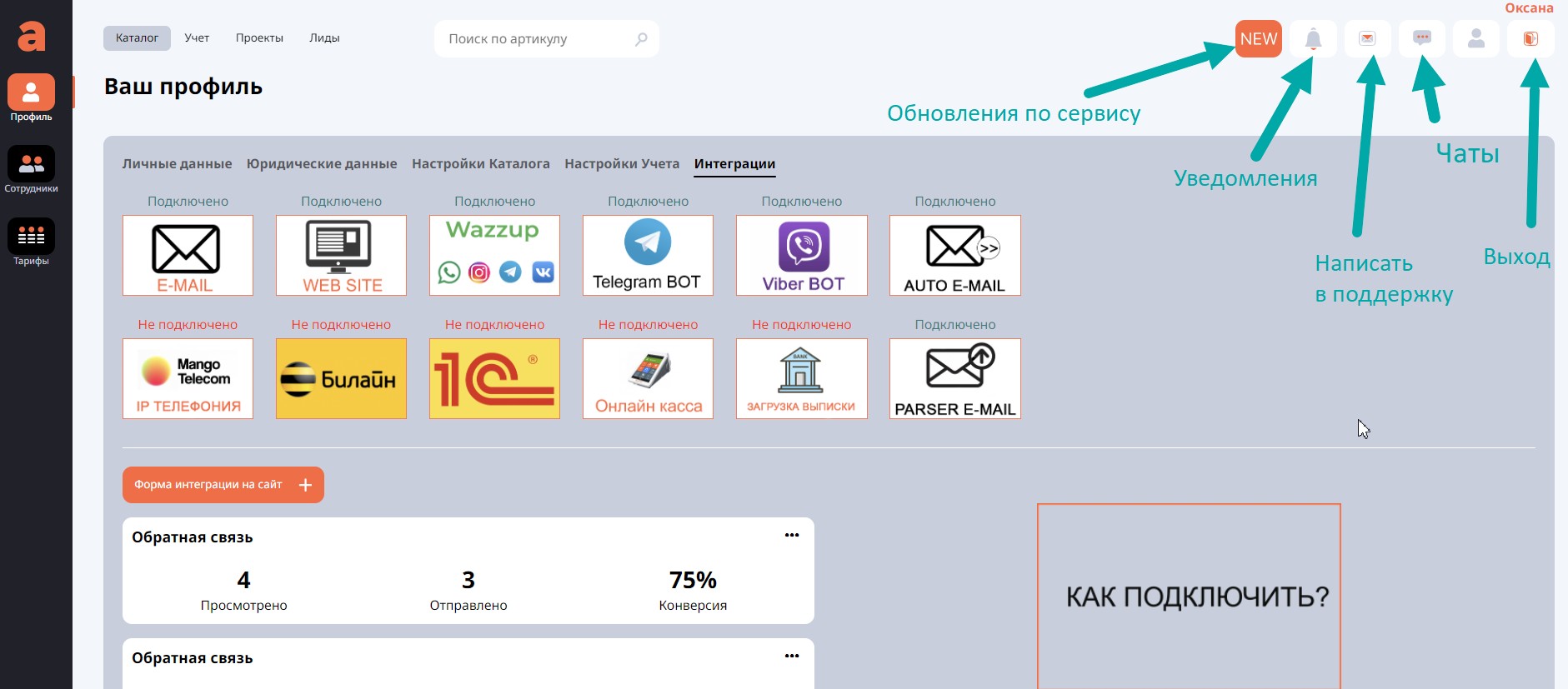 В системе так же есть возможность получать уведомления от самой системы и от сервисов, с которыми настроена интеграция. И на слайде ниже вы увидите назначение каждой кнопки меню справа сверху.