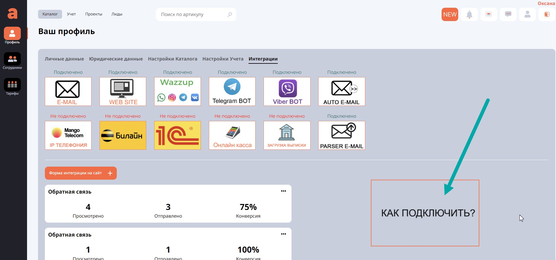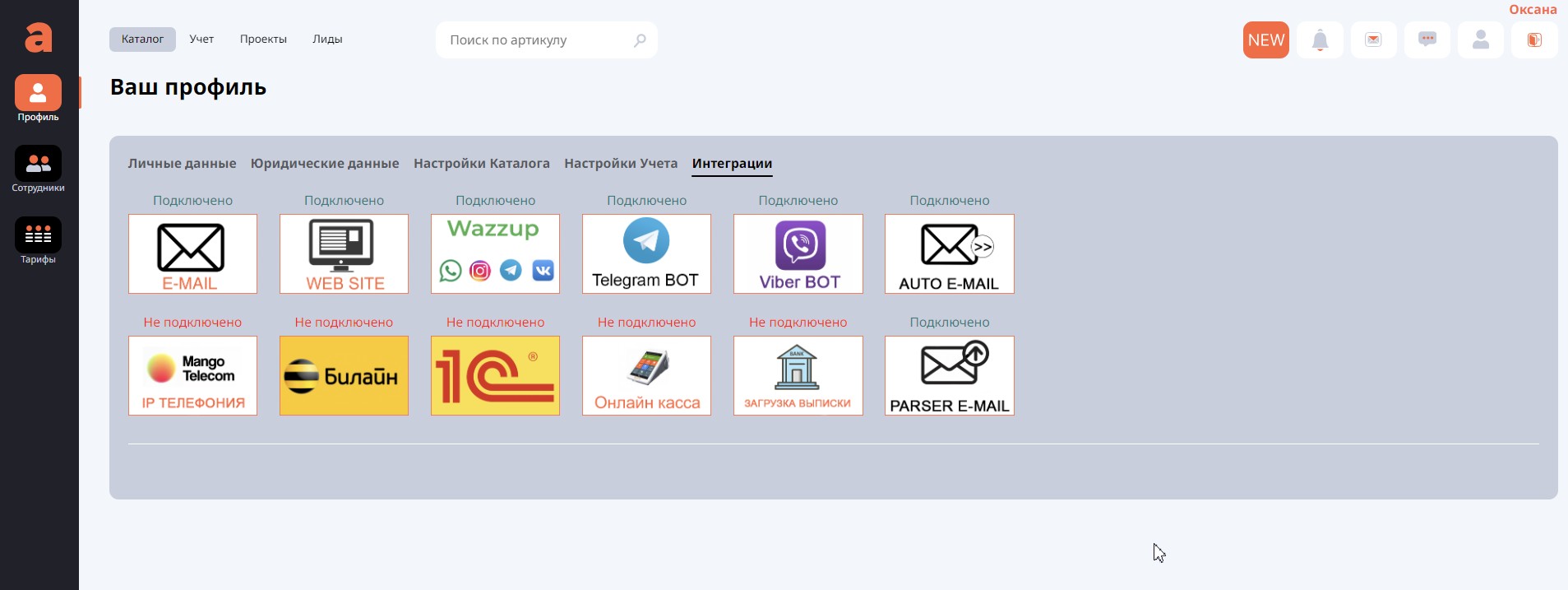 Раздел Интеграции позволяет настроить интеграцию CRM с различными сервисами – Почтовым сервисом, сайтом вашей организации, 1С Бухгалтерией, подключить к профилю онлайн кассы, IP телефонию Mango Telecom, Билайн, мессенджеры WhatsApp, Viber, Telegram и авто-email- автоматическая отправка клиентам сообщений при смене статуса проекта, парсер Email-сбор заявок с почты.