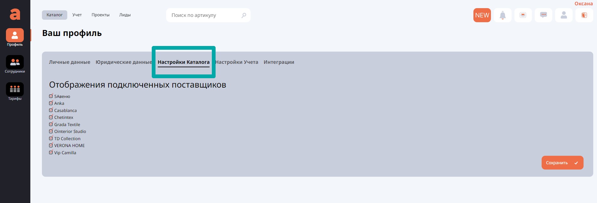 На этой странице отображаются подключенные в вашему профилю поставщики. Подключить поставщиков можно в Аспиот, заключив с ними договор. В этом случае вы сможете работать с Каталогом коллекций, просматривать наличие, разбивку и стоимость товара и делать заказы.