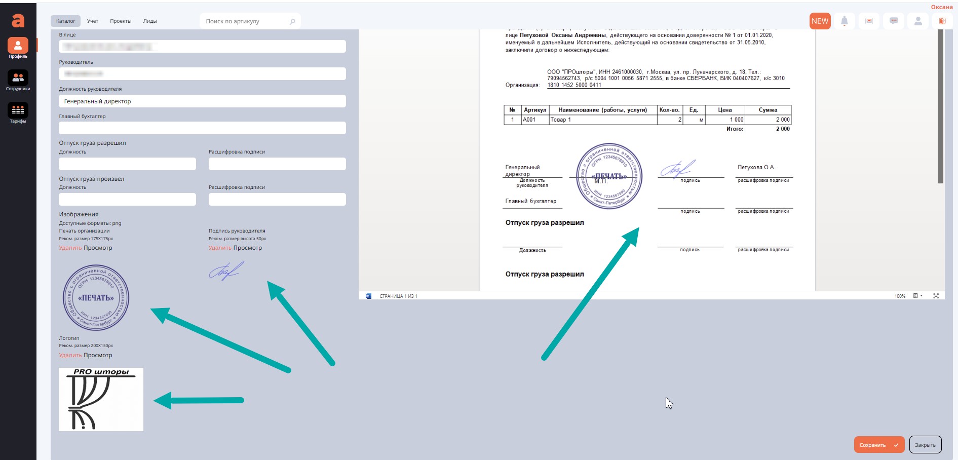 В разделе Данные для печатных форм можно загрузить сканы подписи и печати, для возможности формирования печатных форм документов с Вашей подписью и печатью, а также логотип вашей компании.