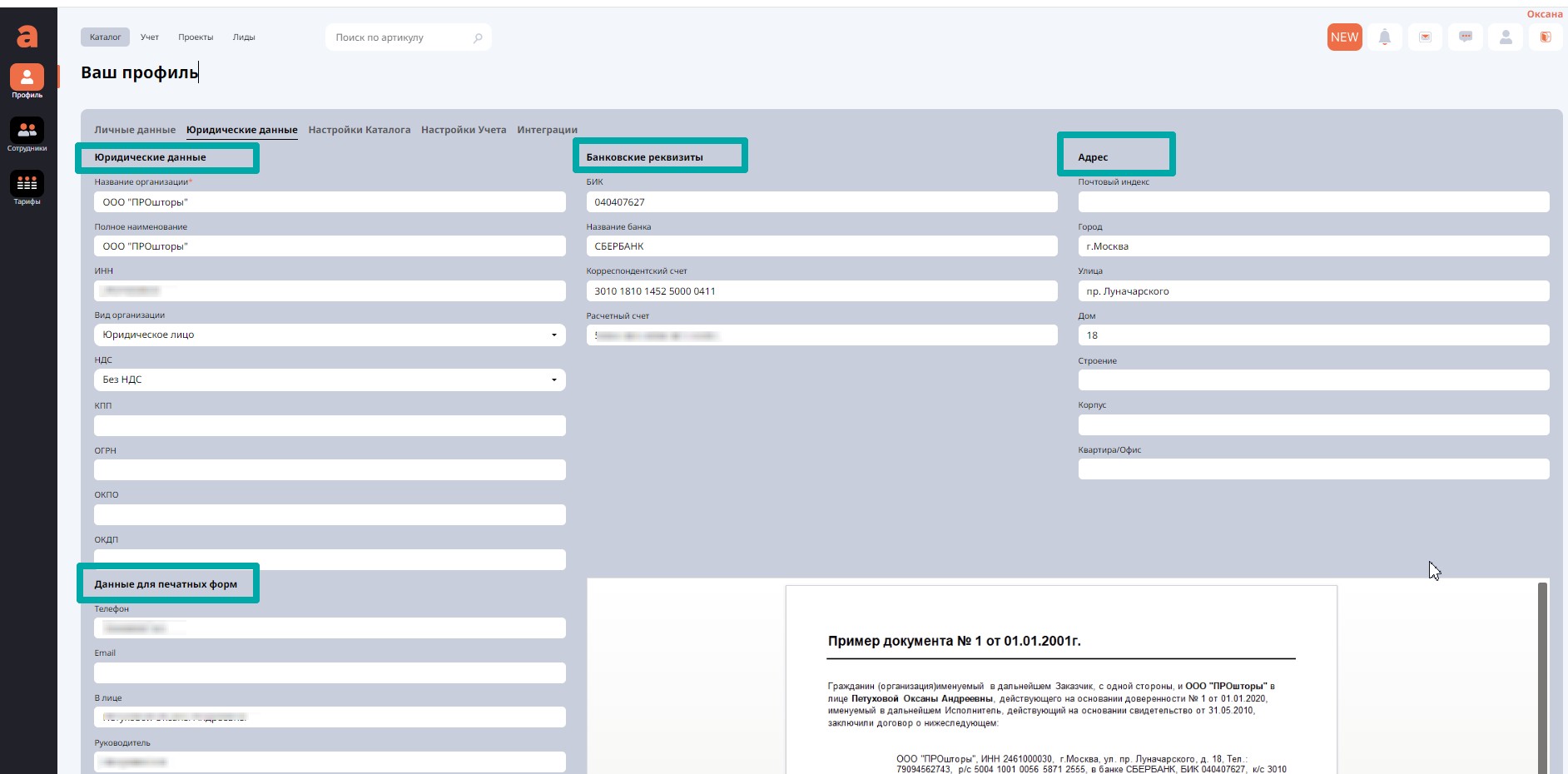 Для каждой своей организации внесите информацию в разделы Юридические данные, Банковские реквизиты, Адрес, Данные для печатных форм.