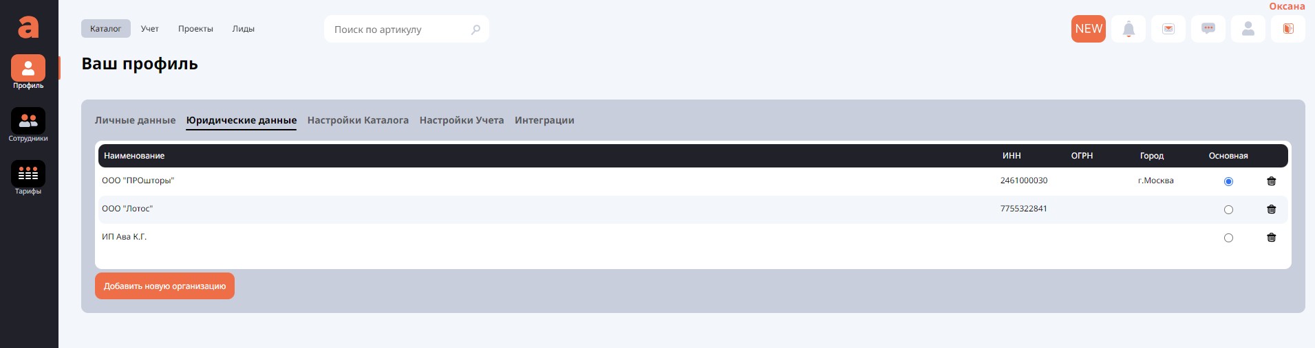 Следующий раздел - Юридические данные. На это странице вы можете внести несколько своих организаций, учет в которых вы предполагаете вести в Аспиот.