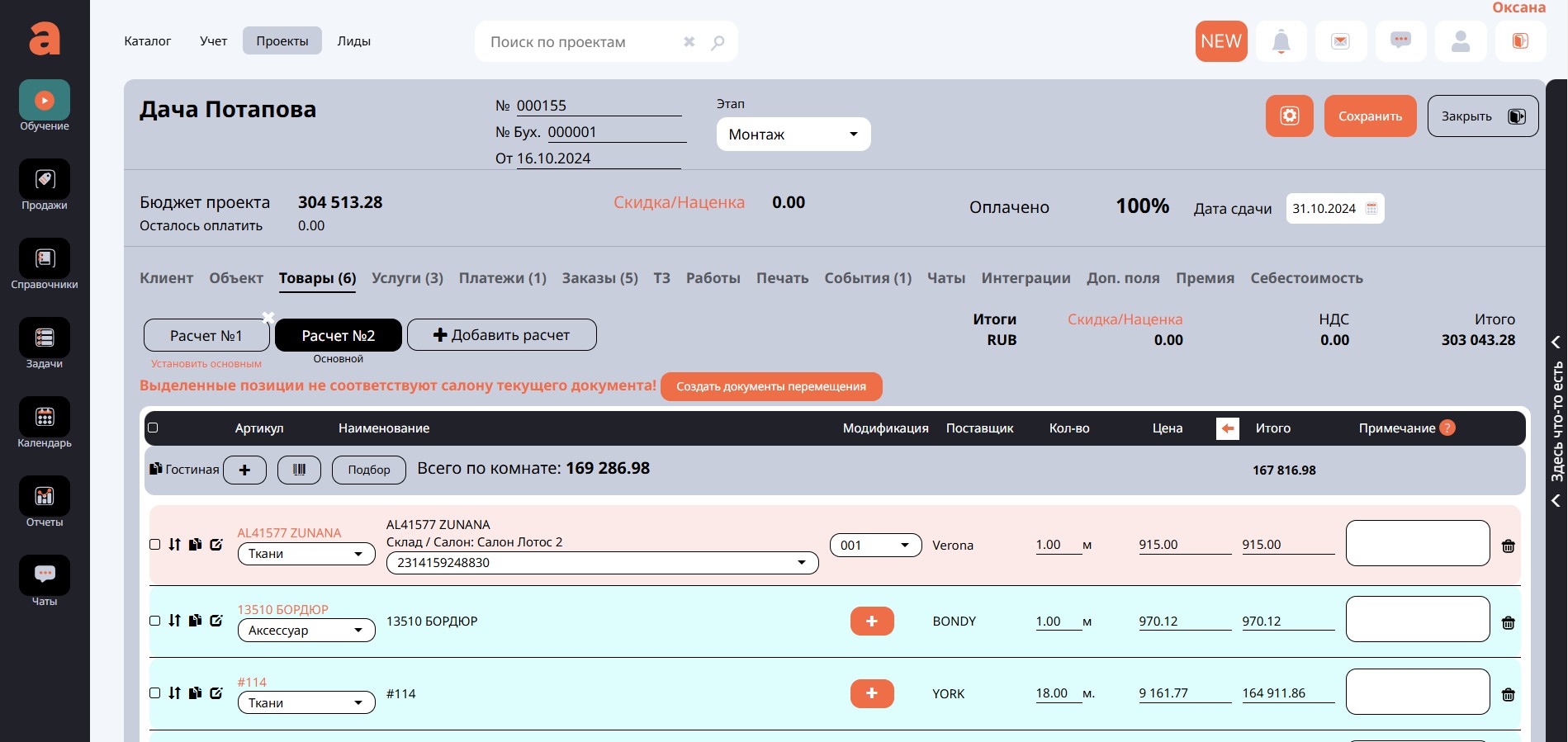 Допустим у вас несколько салонов или складов. При добавлении в проект товара, который находится в другом салоне/складе, вы сможете его использовать в своем проекте. После сохранения перечня товаров в проекте программа выдаст сообщение о том, что место хранения товара не соответствует текущему и предложит создать документ перемещения. Поскольку при формировании проекта вы еще не знаете, состоится ли этот проект в данном варианте, перемещение товара может быть не актуально в этот момент времени. Но настройка Автоматически создавать документы перемещения при % оплаты дает возможность вам не запоминать когда и какой товар в каком количестве необходимо перемещать со склада или другого салона, а сделает это за Вас при условии, что клиент согласился на данный вариант проекта и оплатил указанную в настройке часть бюджета на этапе проекта Платежи. У вас нет необходимости перемещать товар на этапе формирования проекта, но вы можете это сделать.