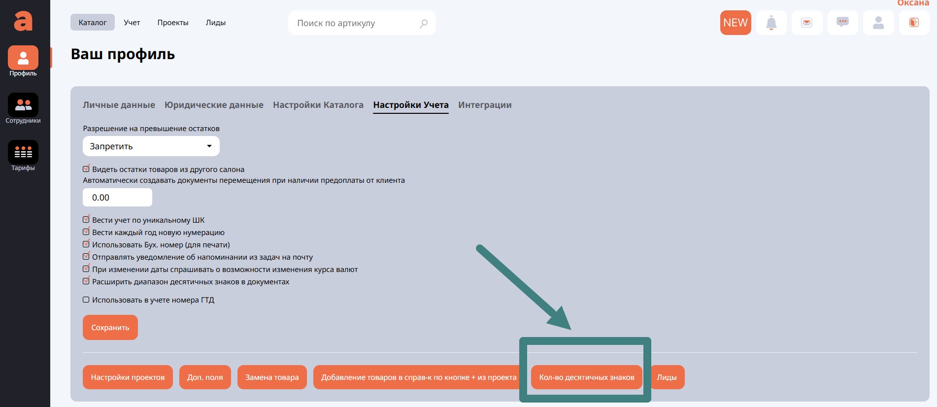 Отметка Расширить диапазон десятичных знаков в документах позволит увеличить разрядность чисел в документах. После установки галочки необходимо более детально настроить по кнопке Кол-во десятичных знаков