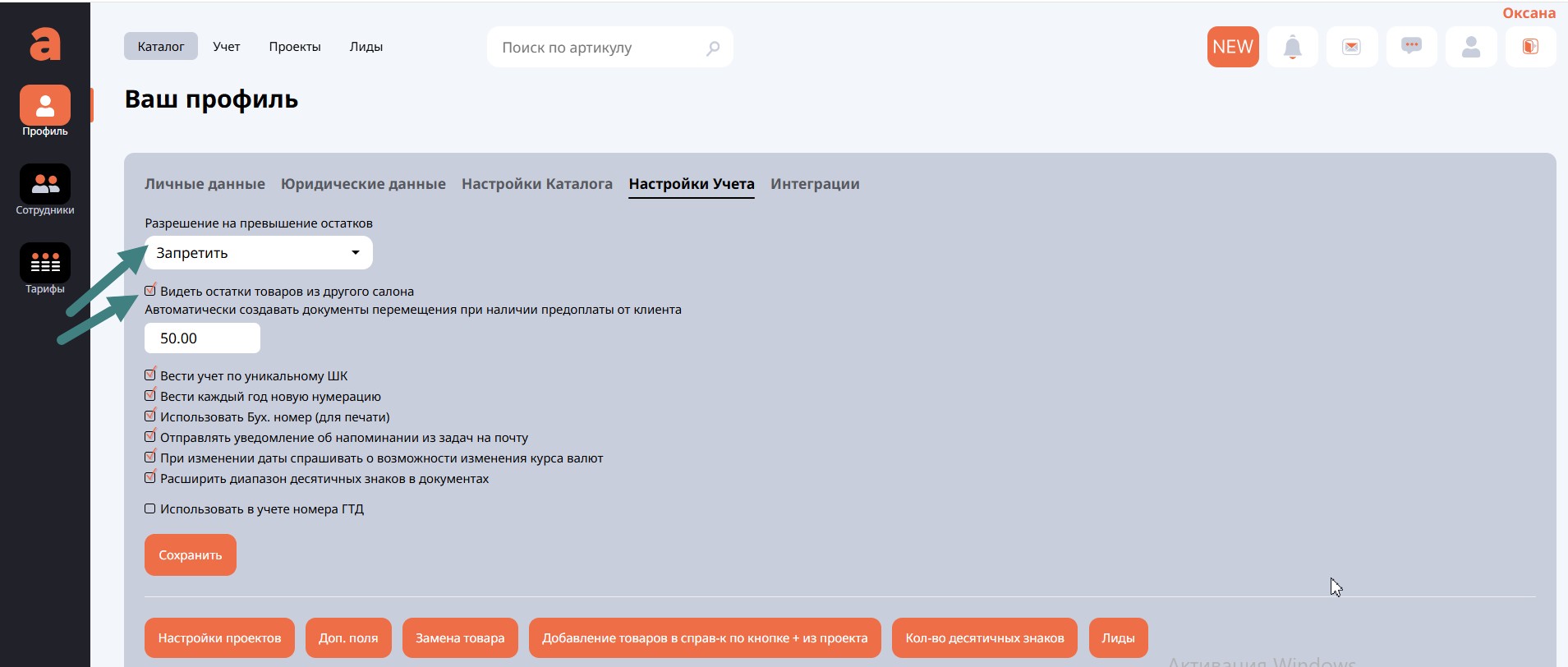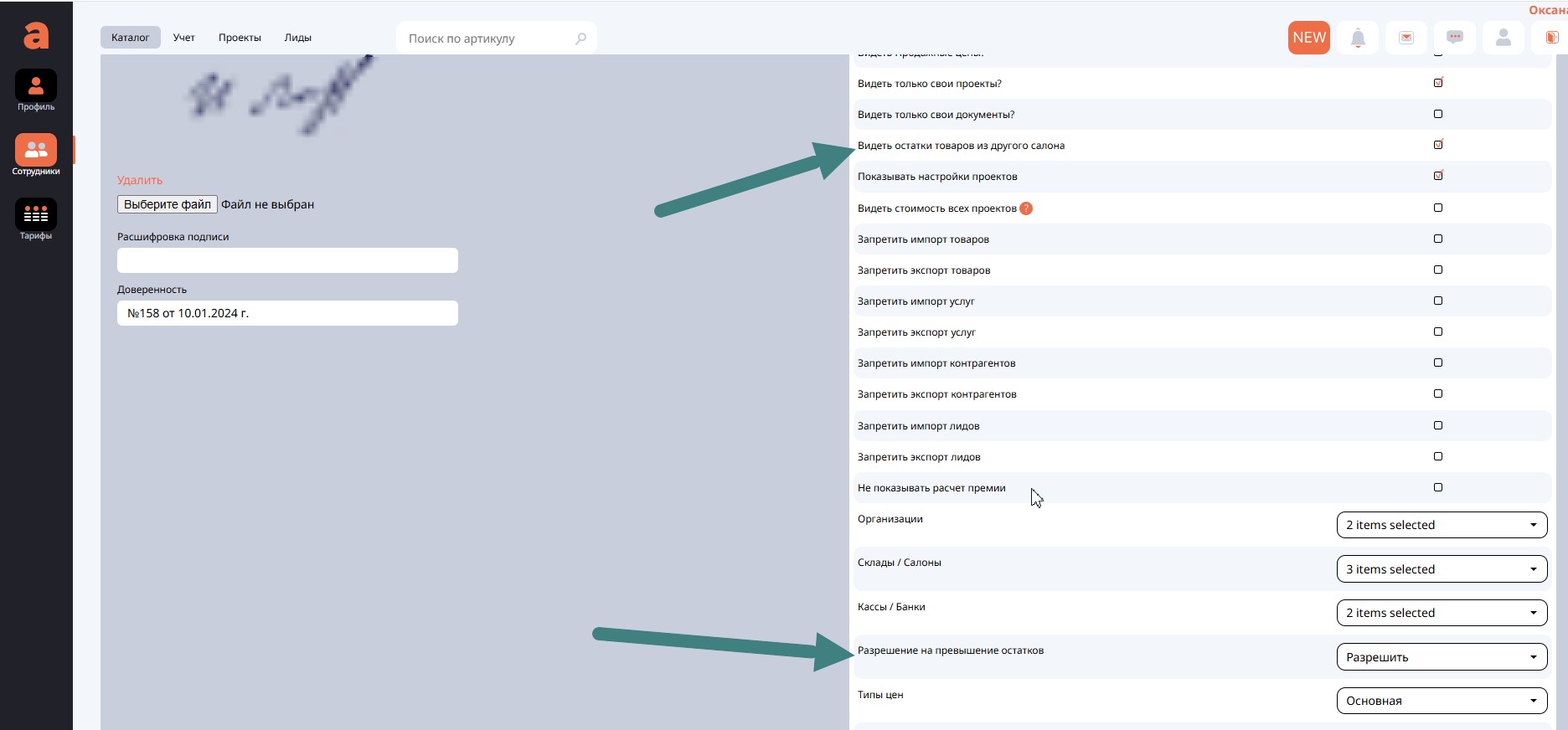Здесь мы можем «запретить» или «разрешить» в целом у всех, кто работает в системе, превышение списания остатка на складе или в салоне товаров при операциях с ними (перемещение со склада на склад или продажа).