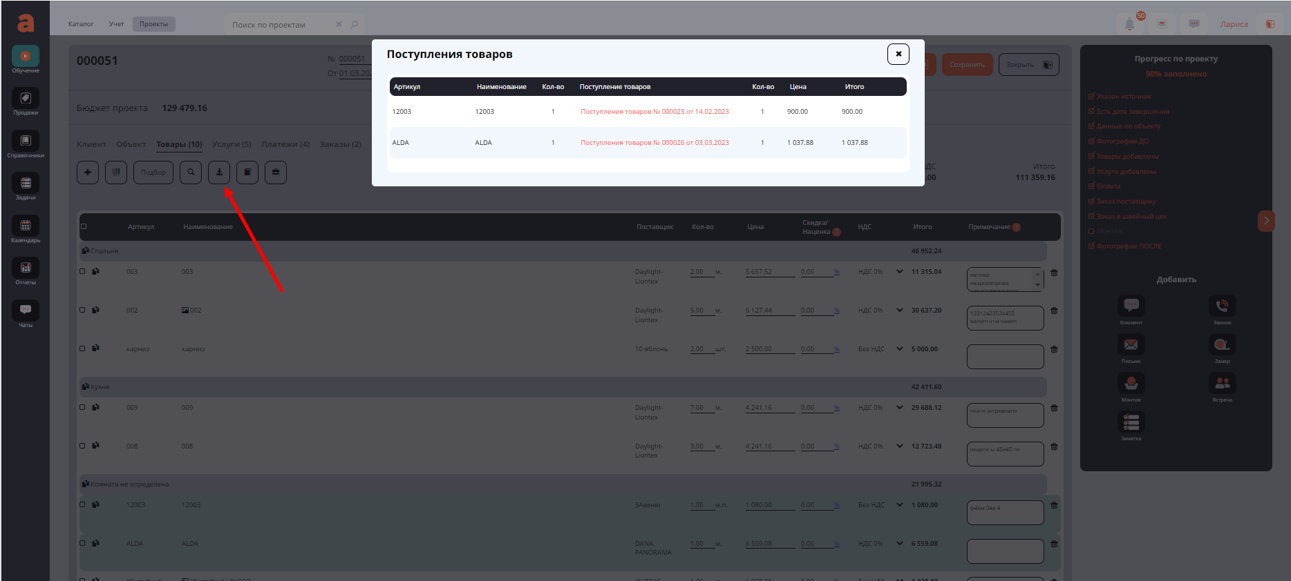 Вы работаете заказными тканями и в настройках проектов установлено галочка "Использовать связку «проект - заказ - поступление», для подсчета себестоимости"