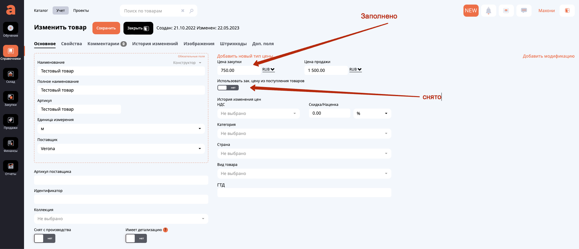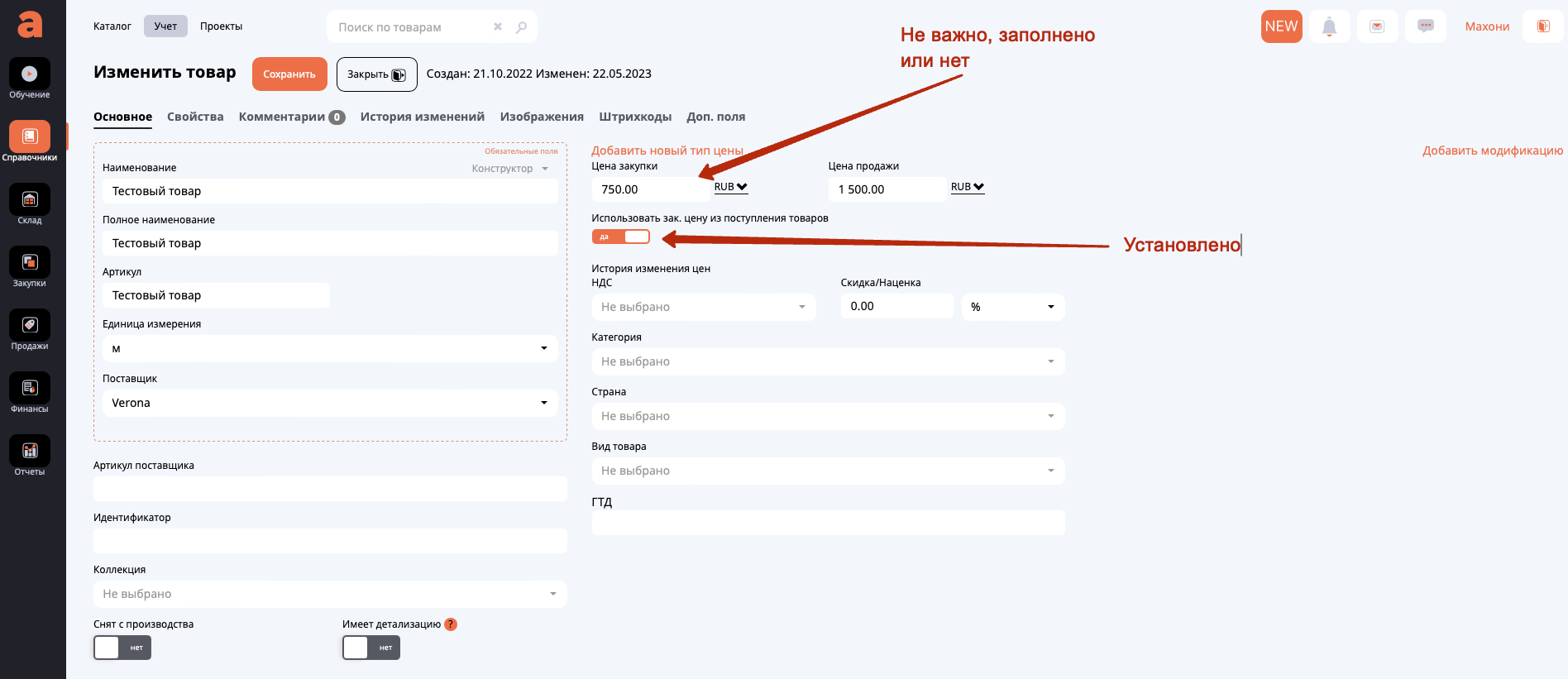 Вы сами устанавливаете цену закупки товара в карточке и Aspiot начинает считать. Здесь есть риск! Нужно соблюдать изменения цены по датам, если задним числом измените цены закупки, тогда может поменяться себестоимость проектов, которые ранее были завершены и все расчеты могут измениться!!!