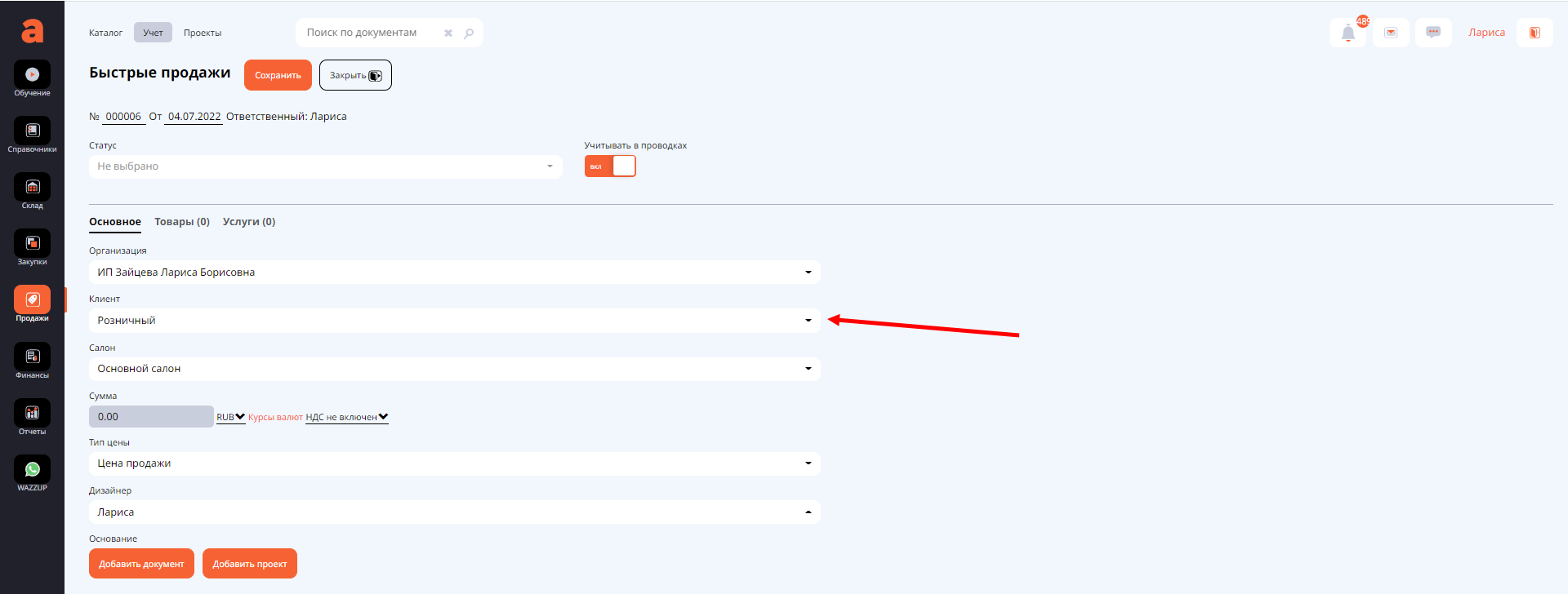 Для ведения операций с быстрыми продажами можно ввести в справочник Клиенты/Контрагенты клиента «Розничный» с признаком в поле Основной - Да. Это означает, что каждый раз при формировании Быстрой продажи этот клиент будет подтягиваться в документ по умолчанию.