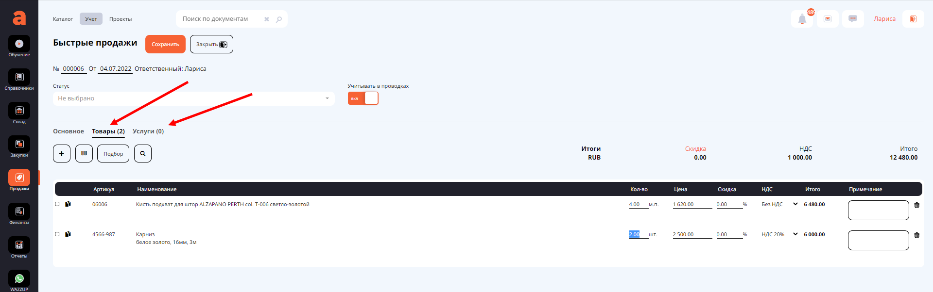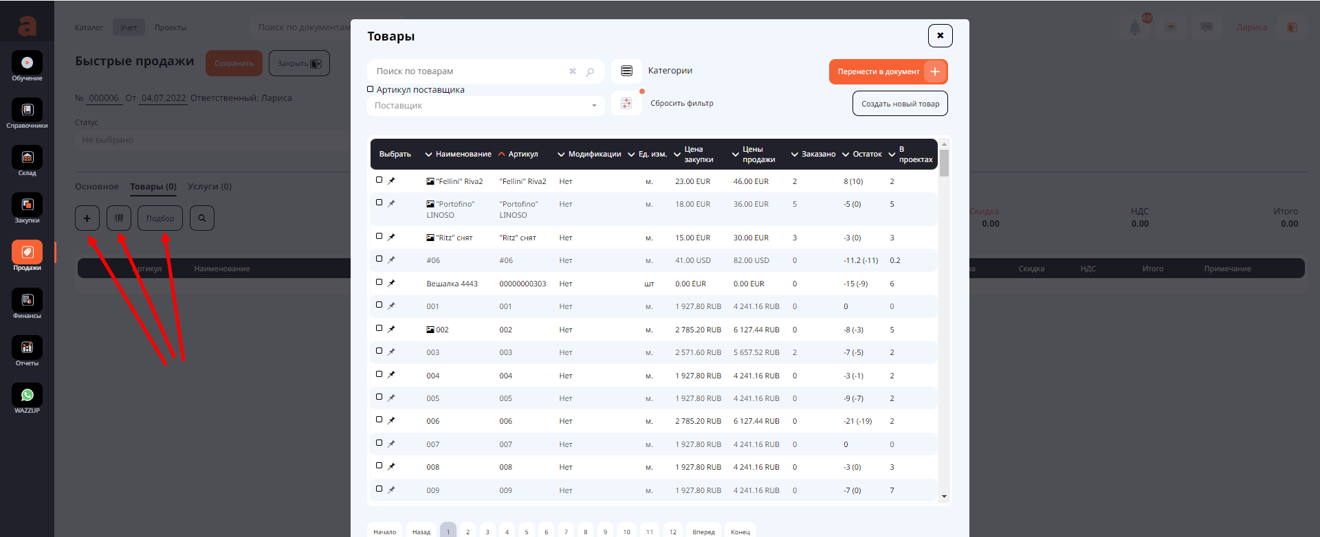 На вкладке Товары кнопками «+», Добавить по штрих-коду и Подбор, как и в проекте, добавляем товары.