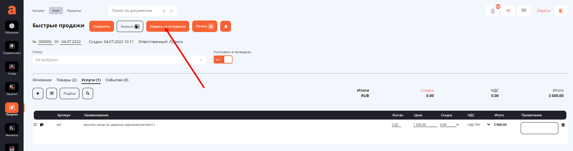 В этом же документе мы можем добавить Услуги. Допустим, ваш покупатель приобрел у вас аксессуары, карнизы, и ему понадобится услуга по монтажу этих карнизов.