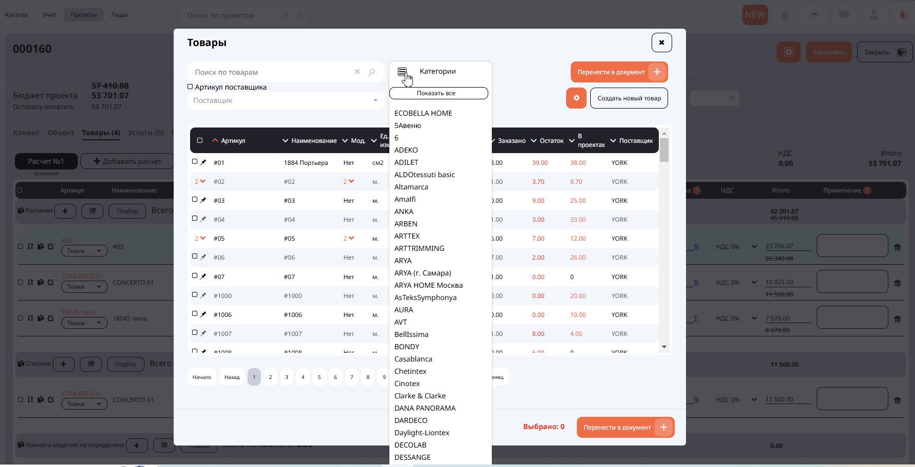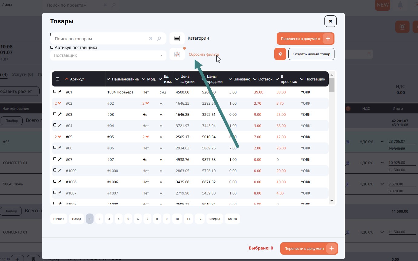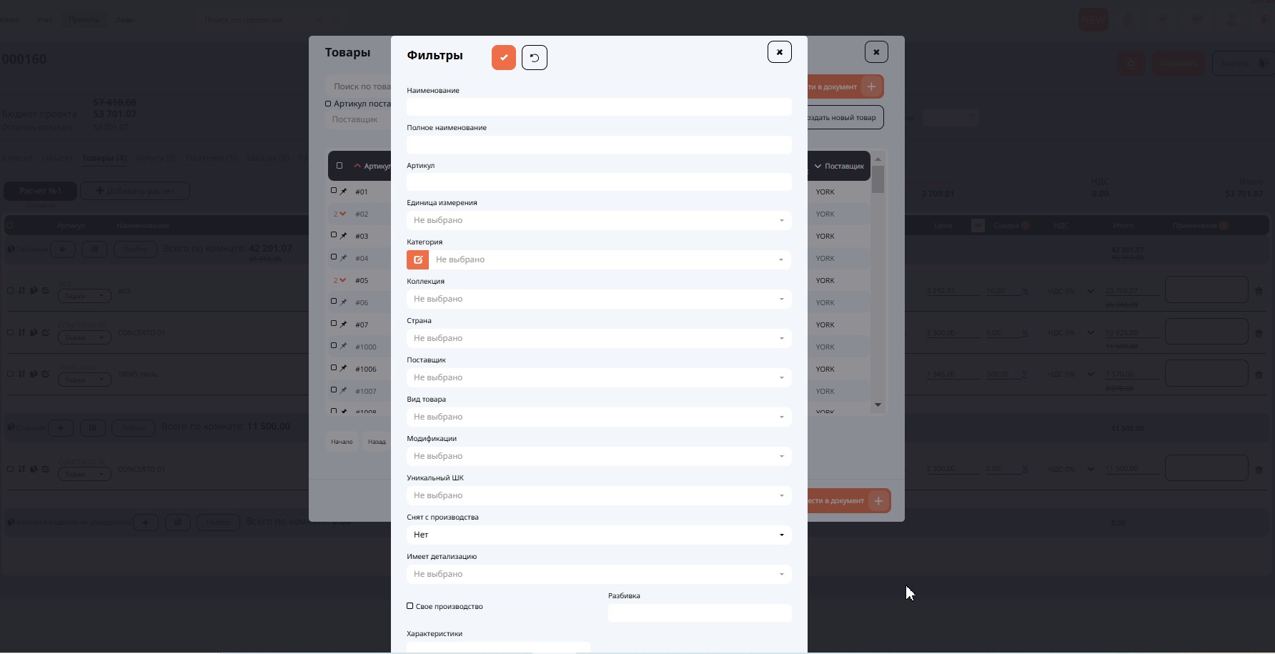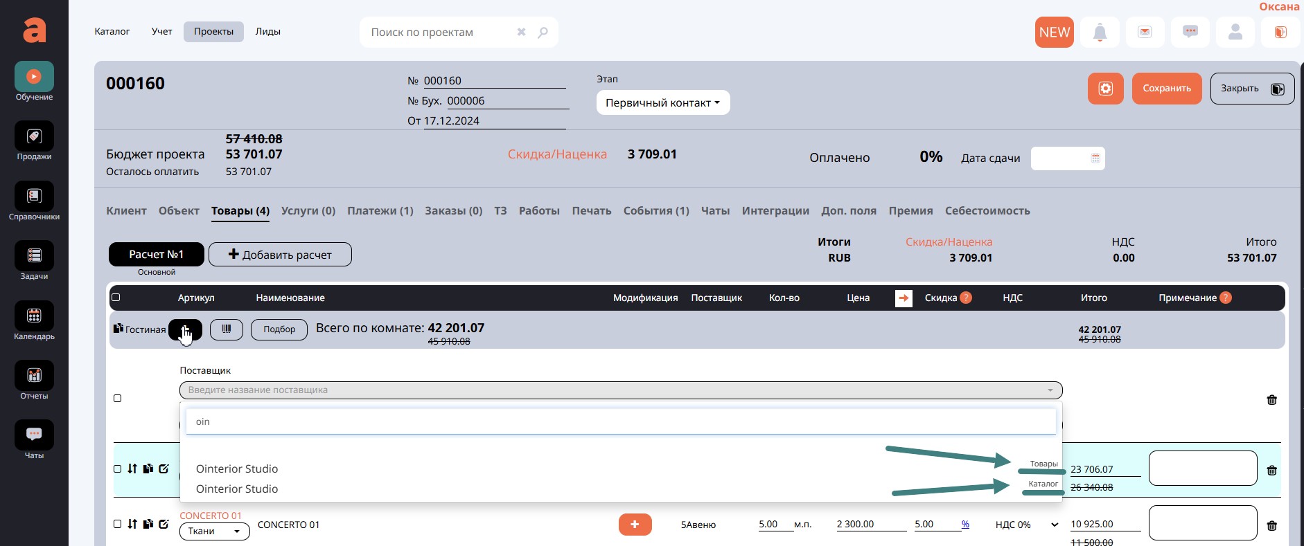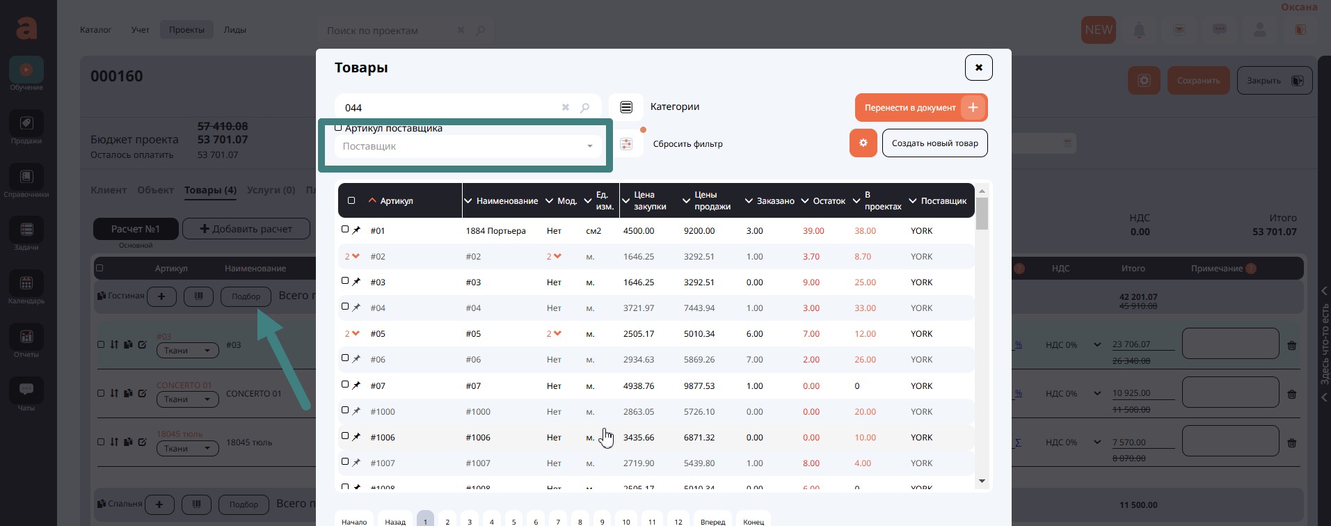 Вы можете добавить товар в проект по кнопке Подбор, откроется окно справочника товаров. В поисковой строке Вы должны набрать артикул или наименование товара. Если вы хотите организовать поиск по артикулу поставщика, то вы устанавливаете галочку в настройке Артикул поставщика, и указываете наименование поставщика.