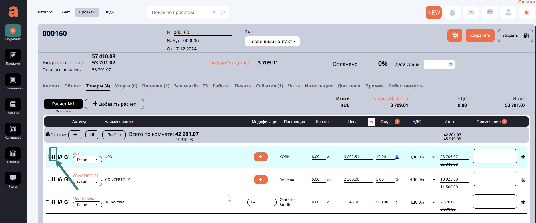 С помощью кнопки Сортировка можно менять местами товары в списке комнат. Для перемещения зажмите левую клавишу мыши на кнопке и перетащите товар в нужное место.