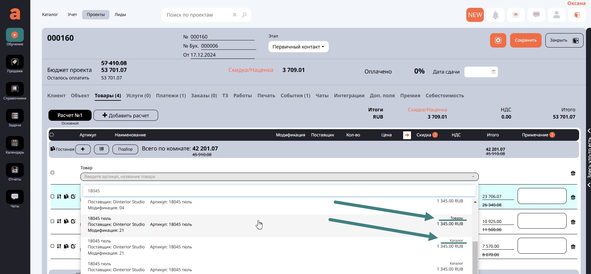 Слева вы увидите артикул, наименование товара, наименование поставщика, и если есть модификации - модификации. С правой стороны вы увидите источник, где программа нашла данный товар и его закупочную стоимость. Если вы нашли необходимый товар, вы добавляйте его в проект. При сохранении товара из прайсов или каталога, этот товар добавится и в ваш справочник товаров.