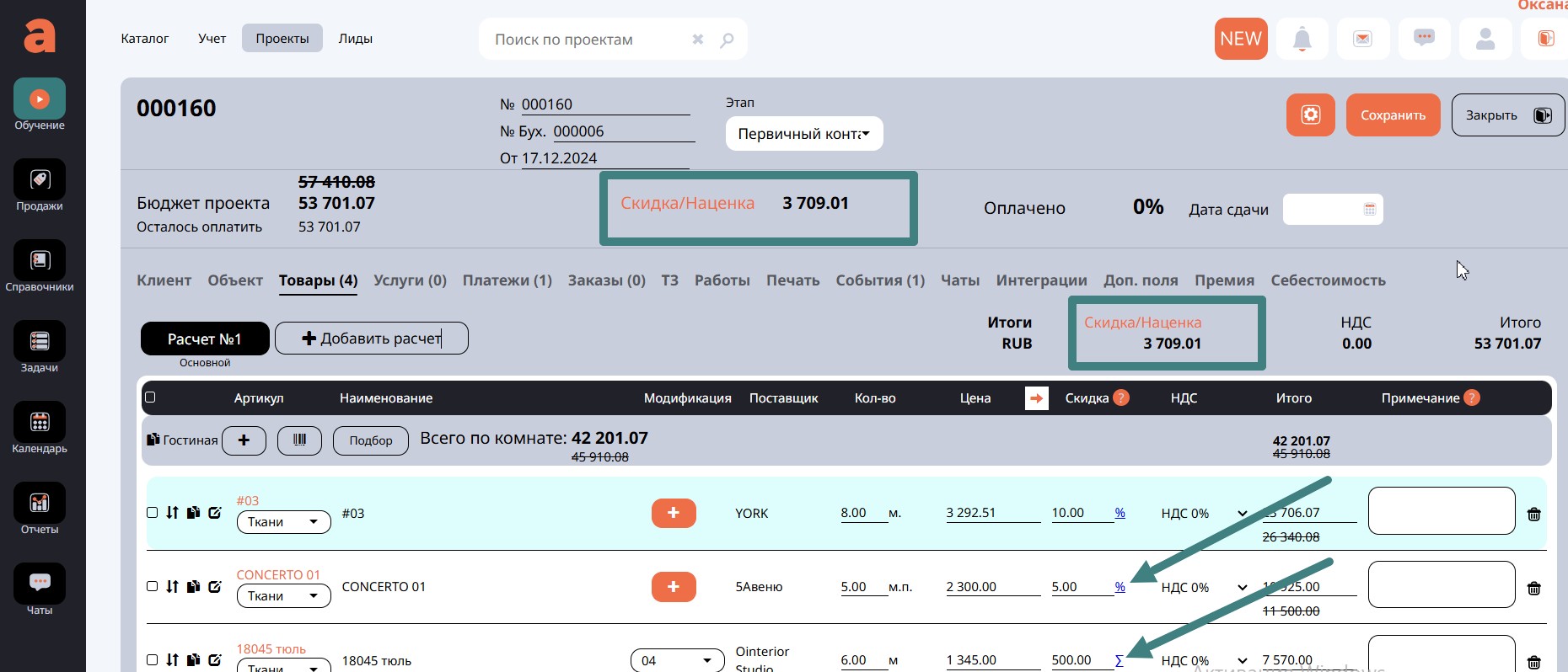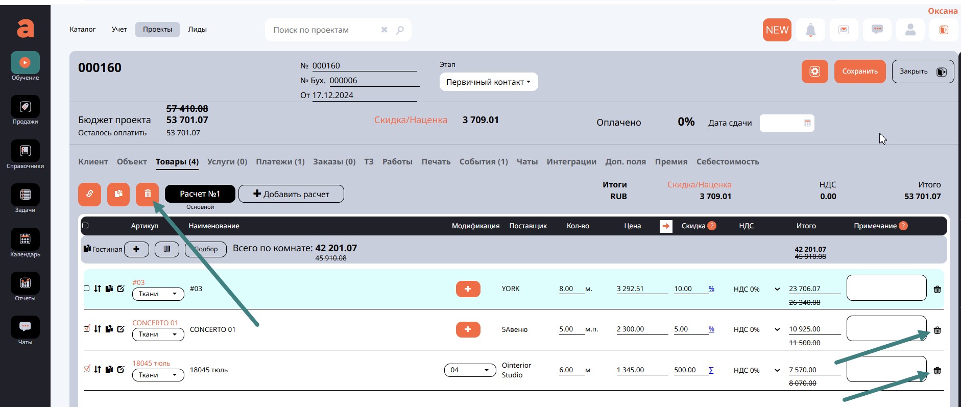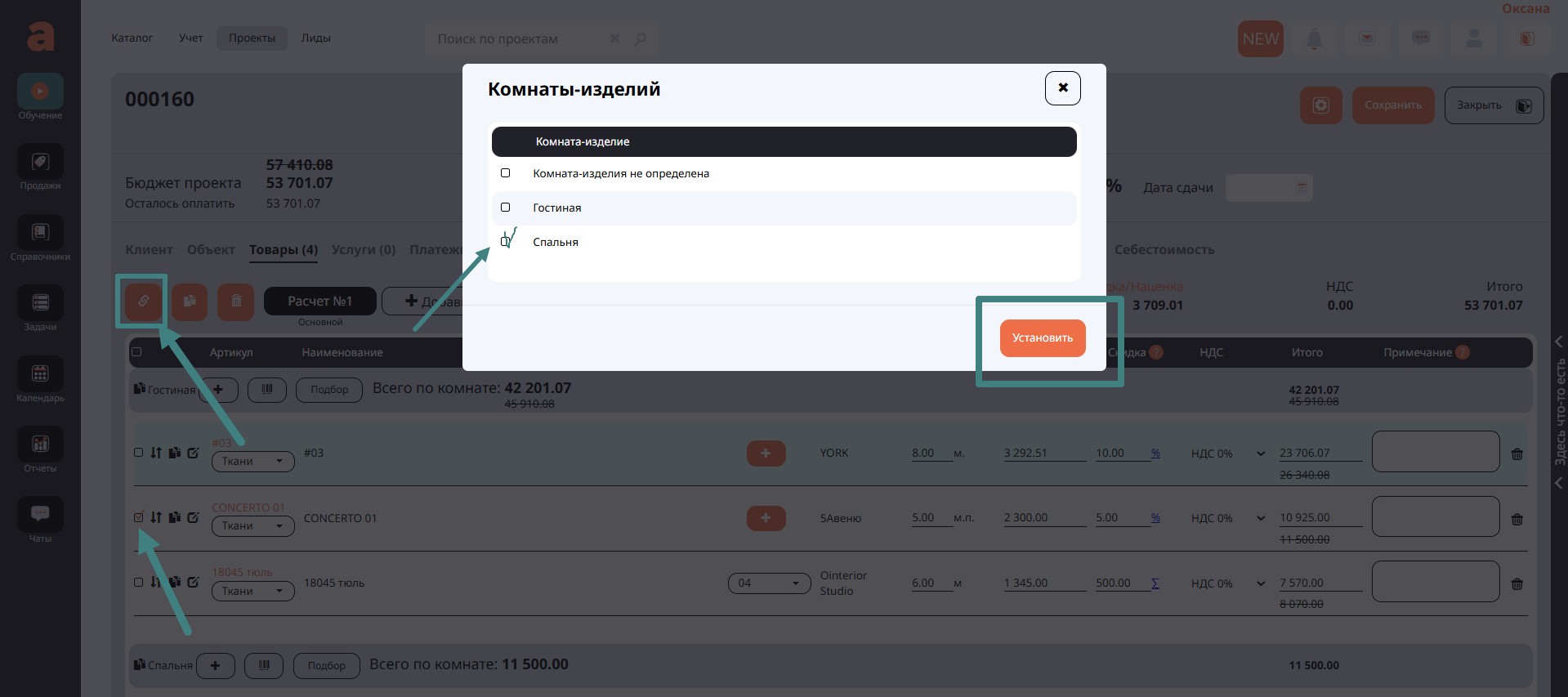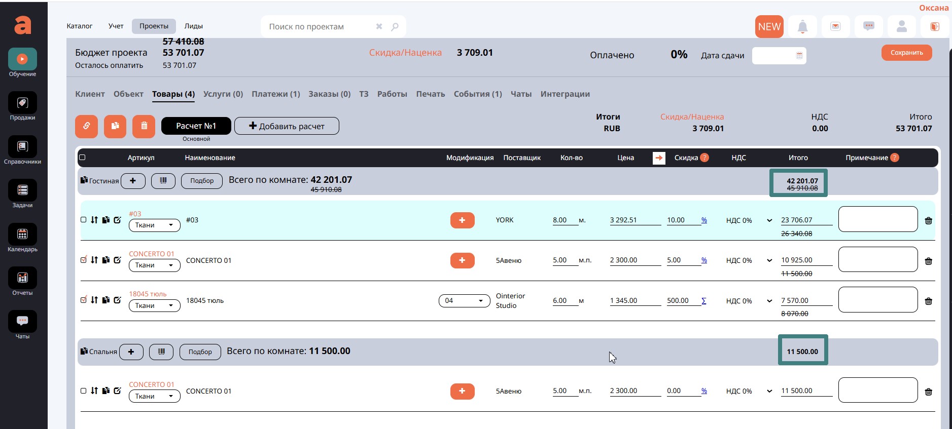 После того, как мы привязали весь товар к комнатам, на экране товар распределится по этим комнатам, и мы увидим для каждой комнаты свою сумму.