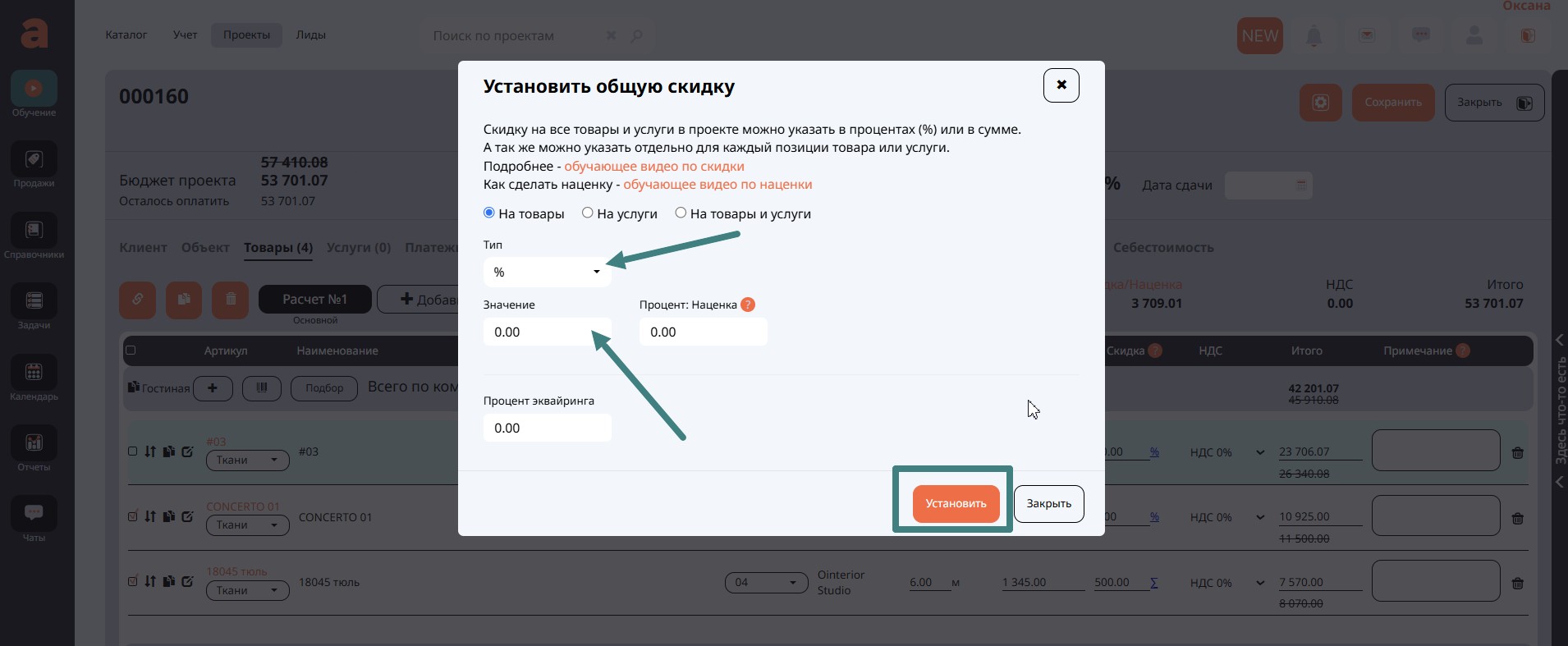Для каждого товара можно установить отдельные скидку в процентах или в той валюте, которая является основной для вашего профиля. Сумма скидок отразится в шапке профиля или над окном с товарами.