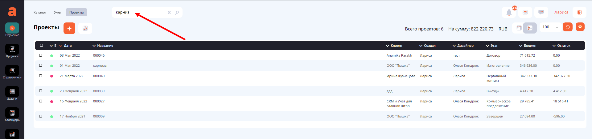 Также для поиска можно использовать поисковую строку. Допустим, нужно найти все проекты, где использовался товар Карниз.