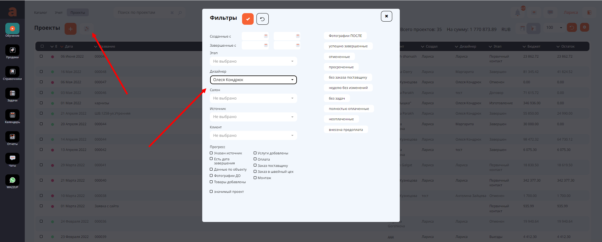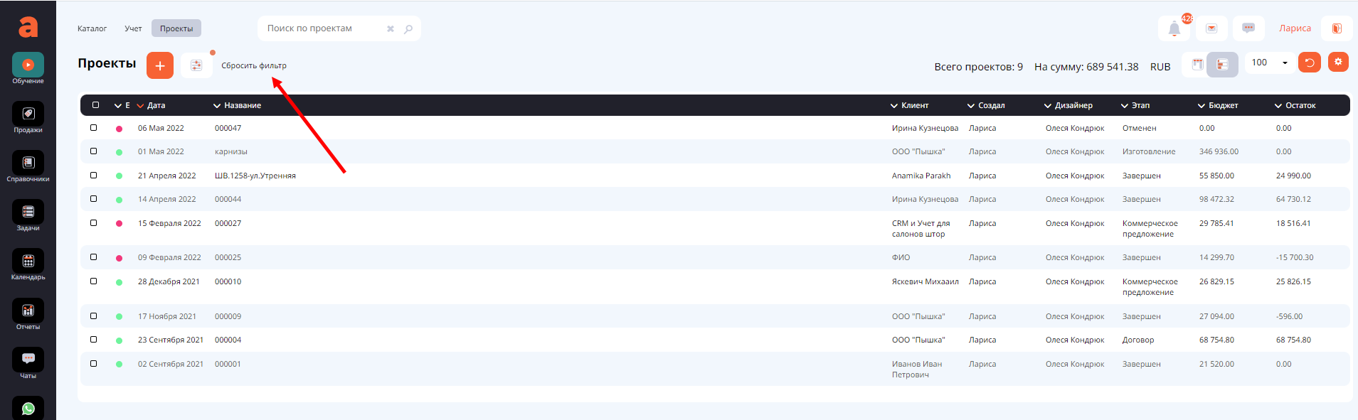 Внесите в поля настройки фильтра информацию, соответствующую проекту, и программа найдет вам все проекты, которые содержат эту информацию. Если рядом с кнопкой настройки фильтра вы видите красный кружок, значит работает установленный фильтр. Чтобы увидеть все проекты, нажмите на кнопку Сбросить фильтр.