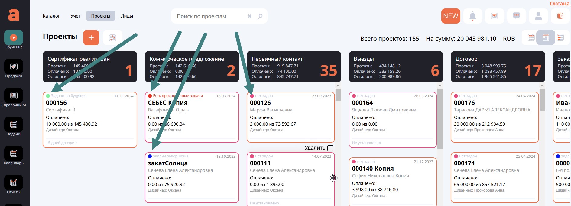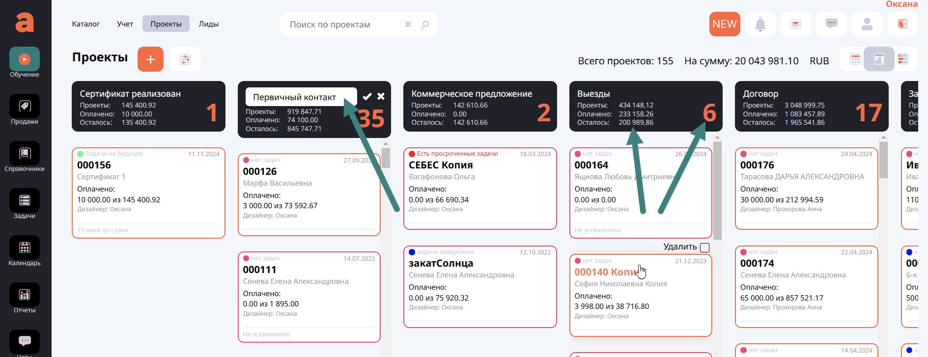 У каждого этапа можно увидеть информацию сколько проектов находится на данном этапе и их общую сумму.
