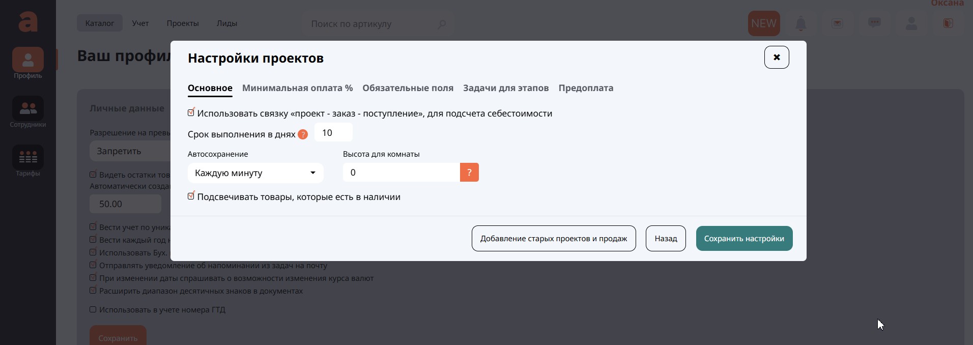 Каким образом будут ваши сотрудники и вы управлять проектами определяется настройками. Общие настройки для всех – в вашем профиле в разделе Настройки учета. Кнопка Настройки проекта открывает окно настроек с несколькими вкладками. Как настроить все вкладки смотрите инструкцию по ссылке.