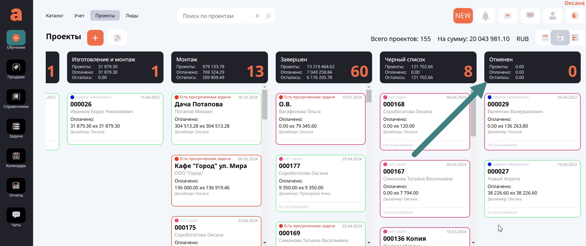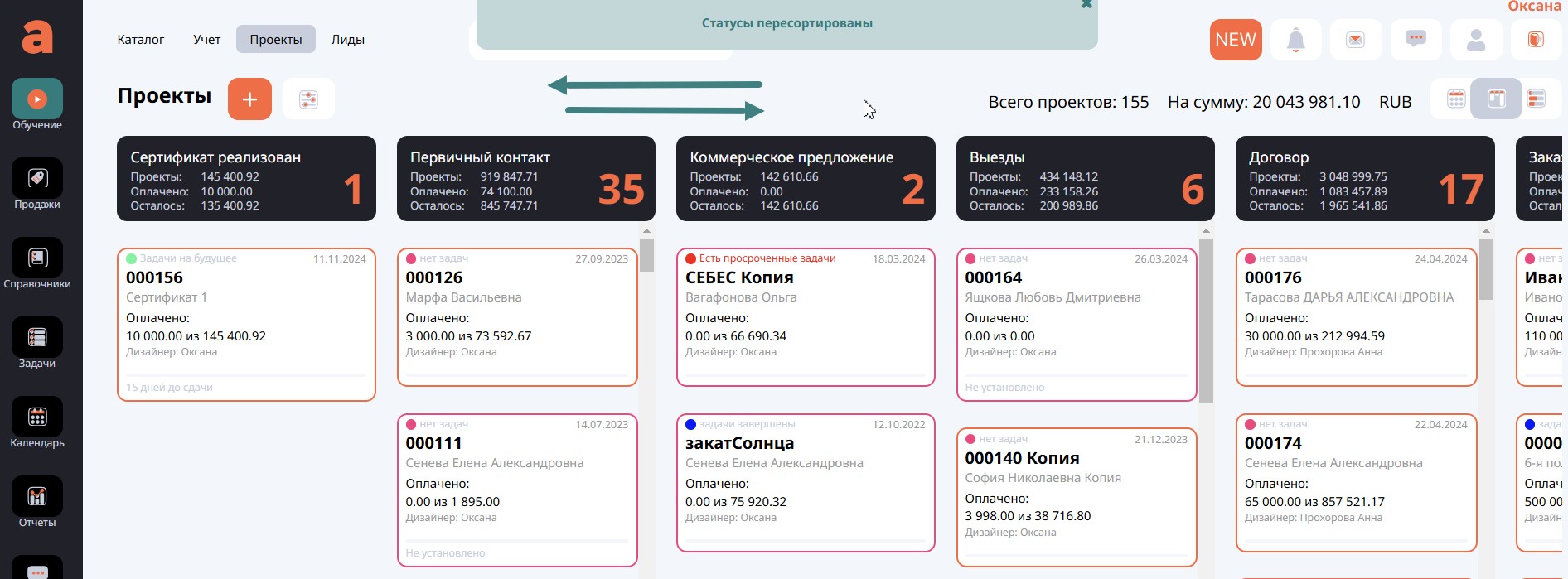 Все проекты находятся в определенном статусе, соответствующем этапу работы над проектом. Если ваши этапы не соответствуют представленному варианту, то вы можете изменить очередность, название этапа и создать новый этап.