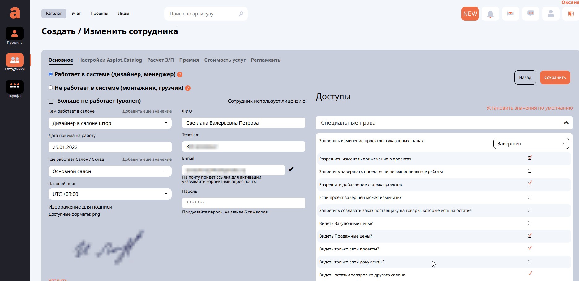 Для каждого сотрудника возможно определить его доступы к различным объектам программы, в том числе и каким образом сотрудник будет работать в проекте.
