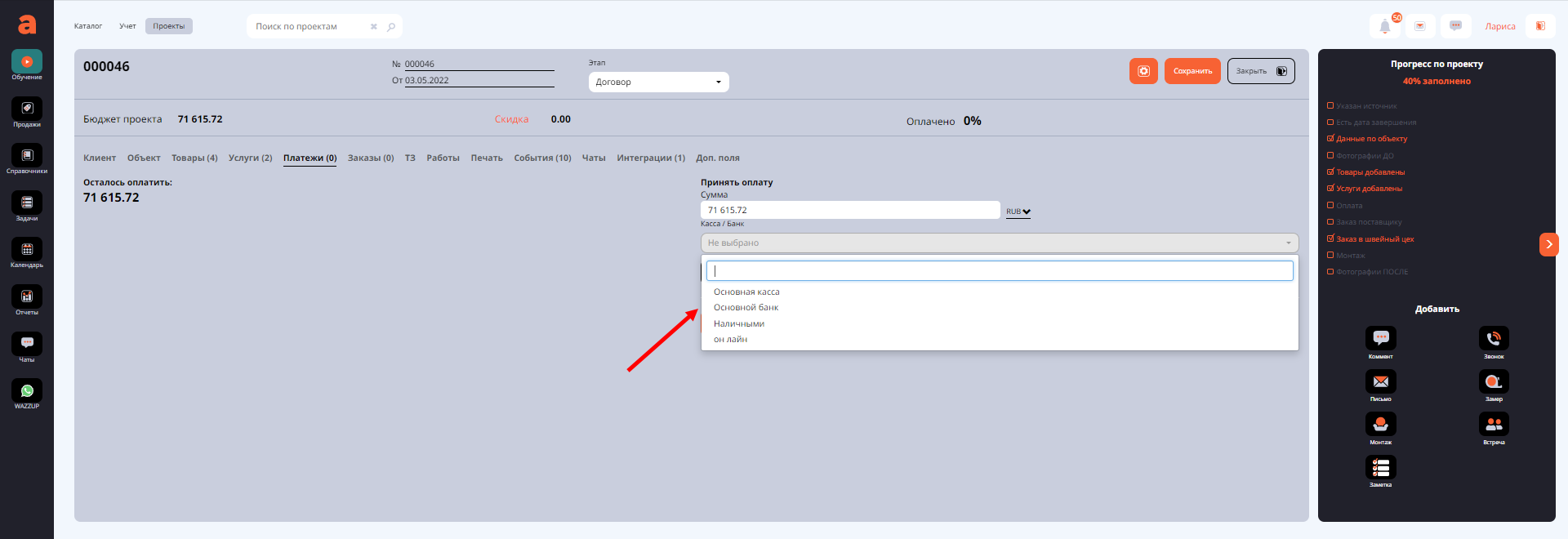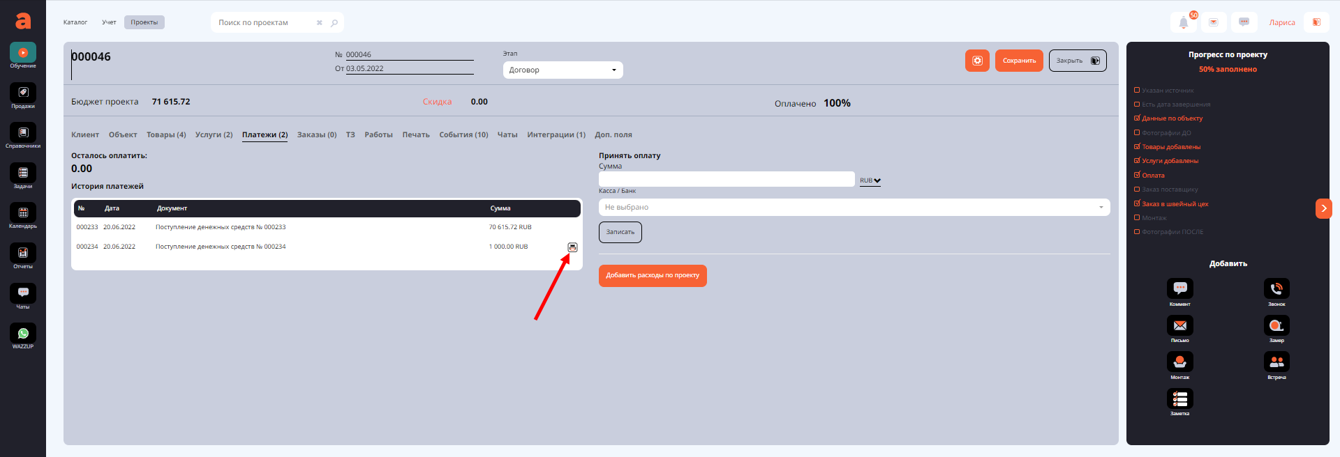 Ваш клиент должен оплатить частями или полностью стоимость проекта . На вкладке проекта Платежи вы сможете оформить документы поступления денежных средств от клиента.