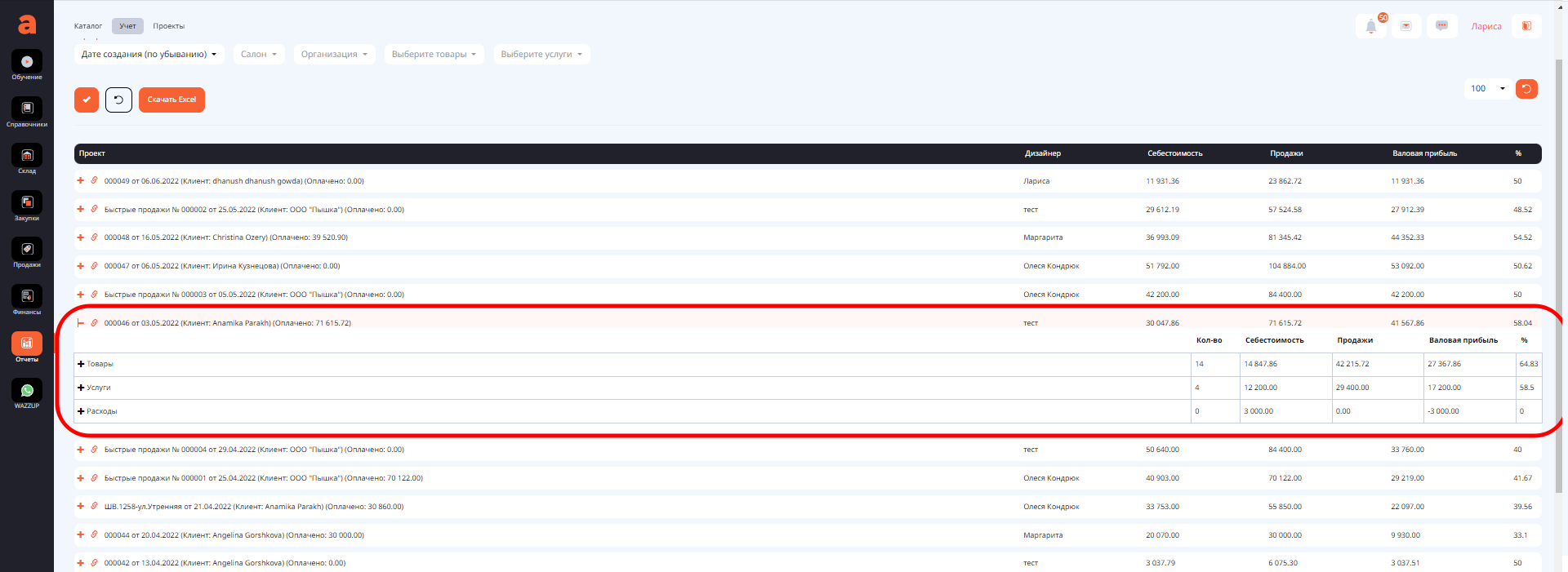 Когда все документы сформированы, сформируйте отчет Продажи и проекты для анализа успешности проекта.