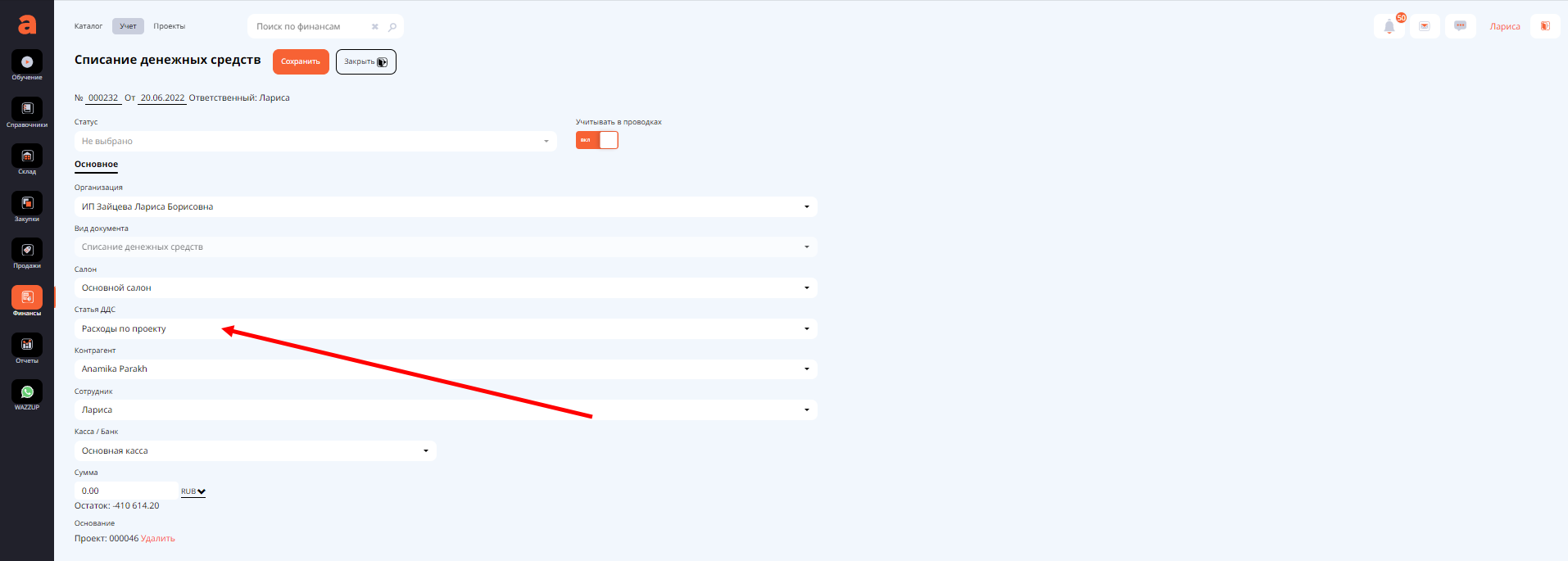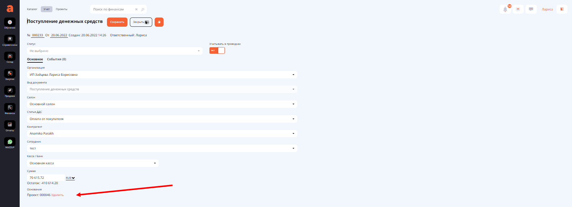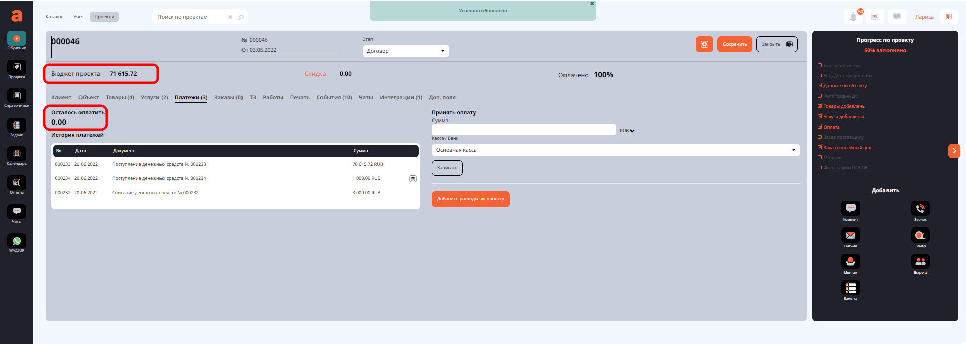 Обратите внимание на то, что этот документ не влияет на сумму Осталось оплатить и Бюджет проекта.