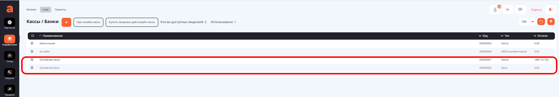 Для проведения оплаты укажите сумму, выберите из списка кассу или банк. Каким образом сформирован этот список касс и банков? В предварительной настройке вашего профиля перед началом работы в программе необходимо было заполнить справочник касса/банка. Перейдём в этот справочник. По умолчанию в каждой профиль добавлено два варианта - основная касса и основной банк.