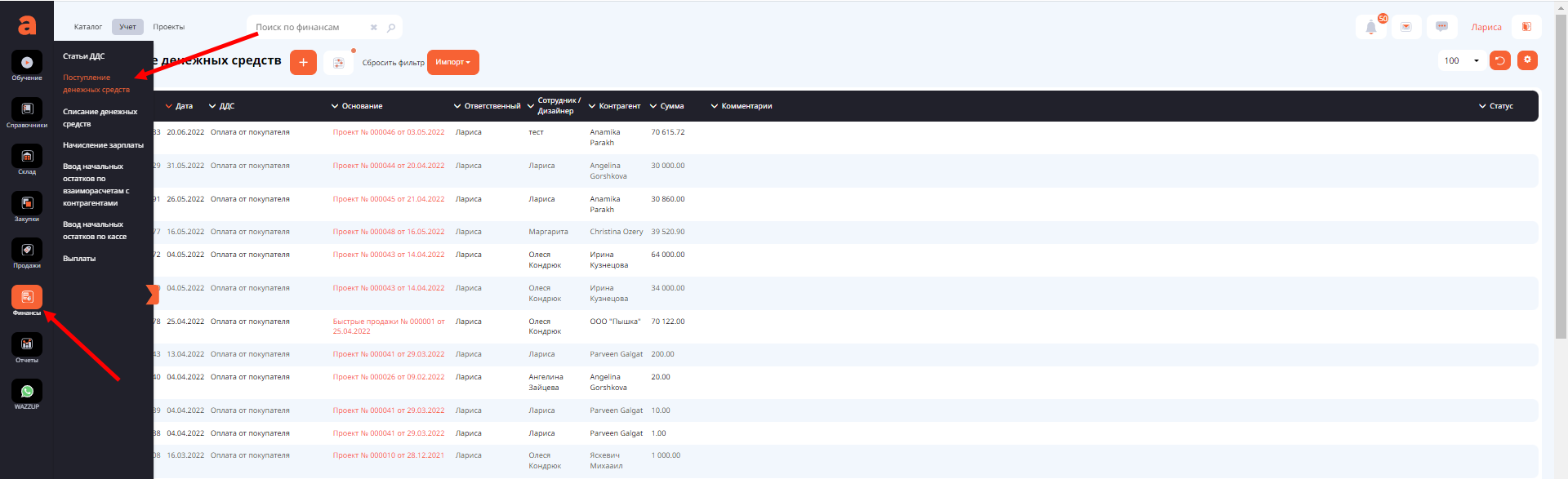 Весь список документов поступление денежных средств вы можете увидеть в разделе Учёт--> Финансы--> Поступление денежных средств.