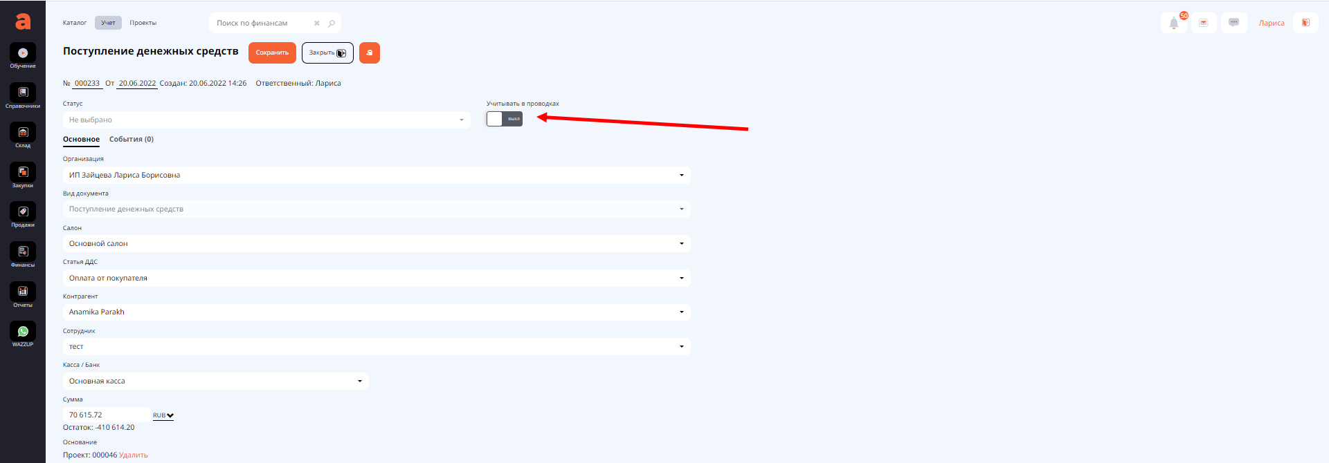 А сотрудник, ответственный за прием денежных средств, открывает этот документ в журнале и устанавливает движок в положение Учитывать в проводках (Вкл), принимает денежные средства и сохраняет документ.