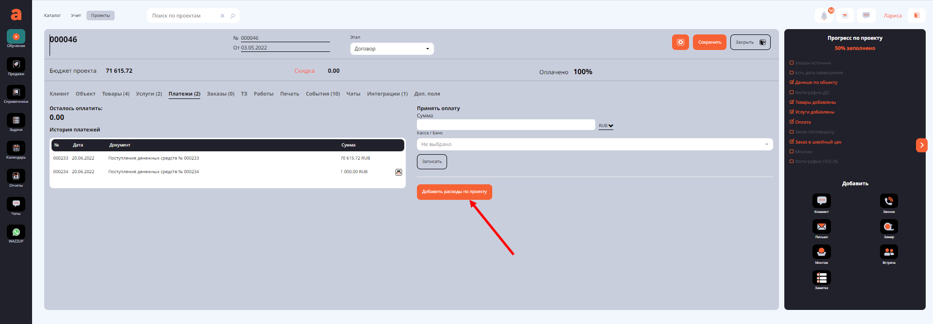 Бывают ситуации, когда вы при работе с проектом тратите несколько больше средств, чем это заложено в бюджет проекта, например вы должны оплатить доставку от поставщика товара, которая не заложена в проект или вы выезжали на замер к клиенту несколько раз на такси. Такие расходы клиент не оплачивает. Как отразить это в ваших расходах? Для этой цели есть кнопка Добавить расходы по проекту.