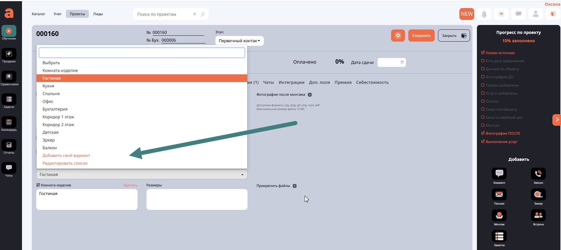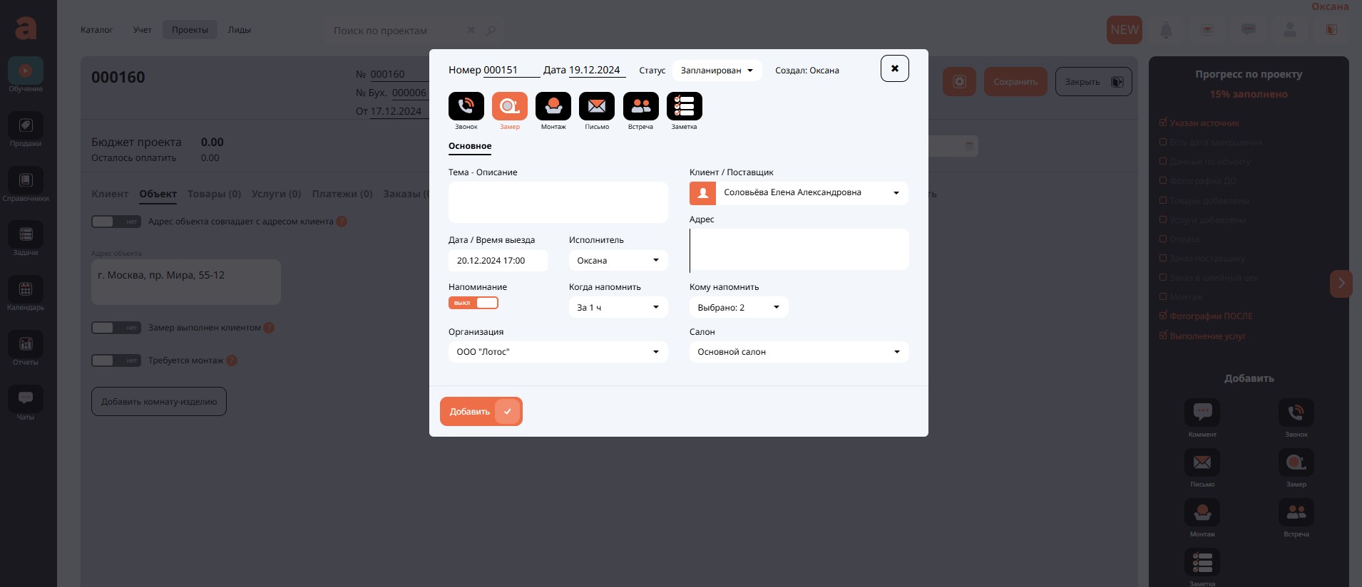 Следующая настройка – движок Замер выполнен клиентом. Если требуется выезд на замер, будет уместно поставить сотруднику задачу выехать на замер.