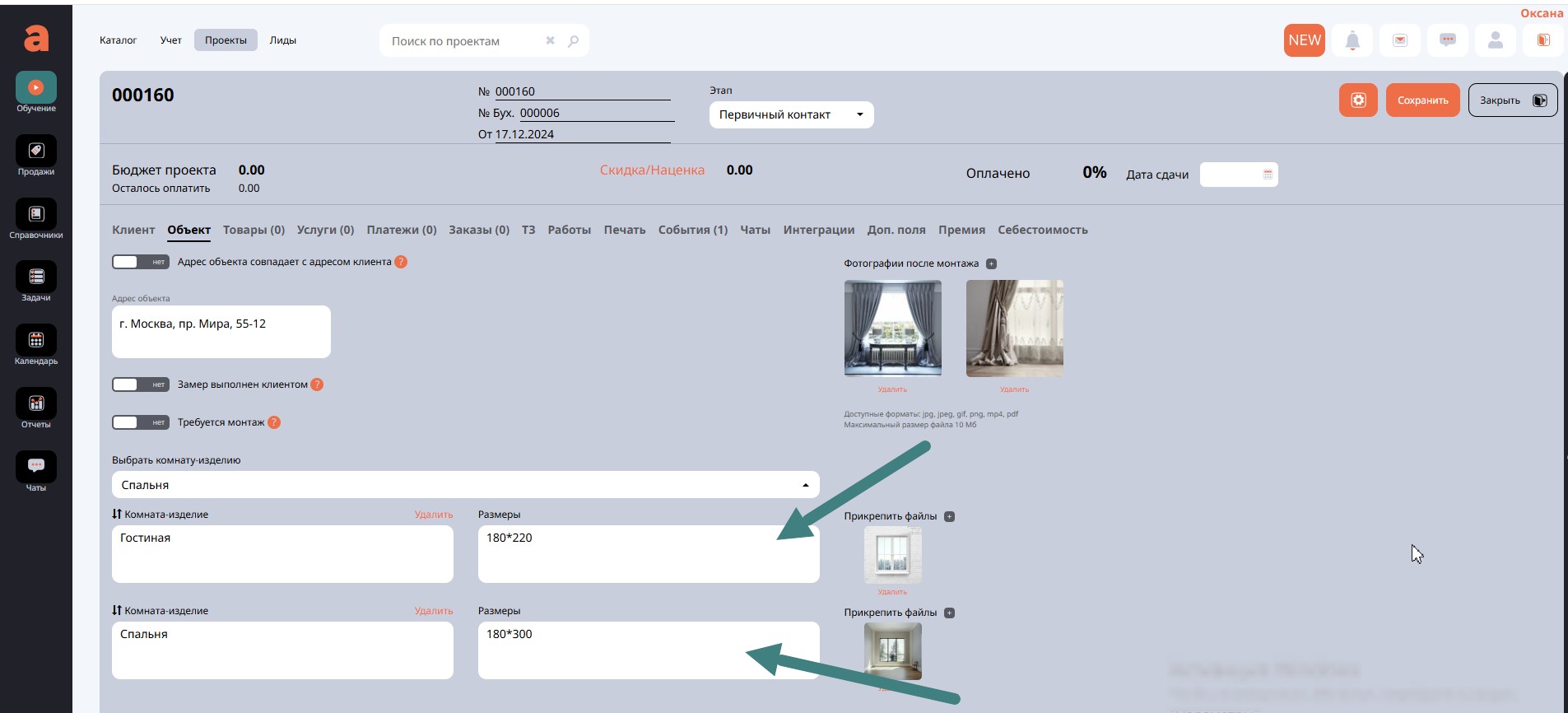 В поле Размеры вы может записать любую информацию, необходимую для выполнения работы, это может быть информация о размерах окна, расстояние между окнами, размер других объектов и предметов.