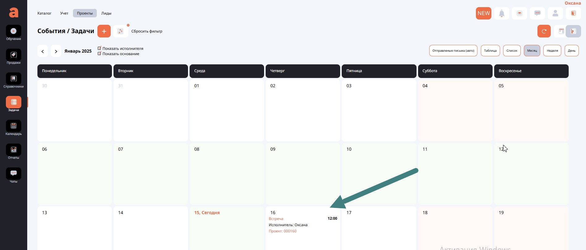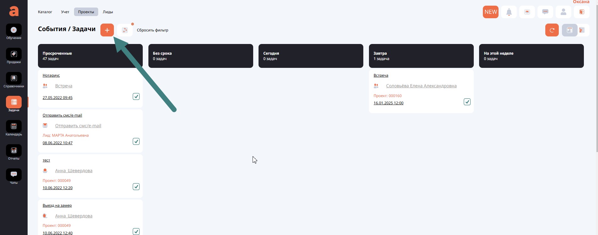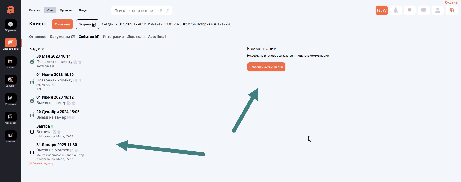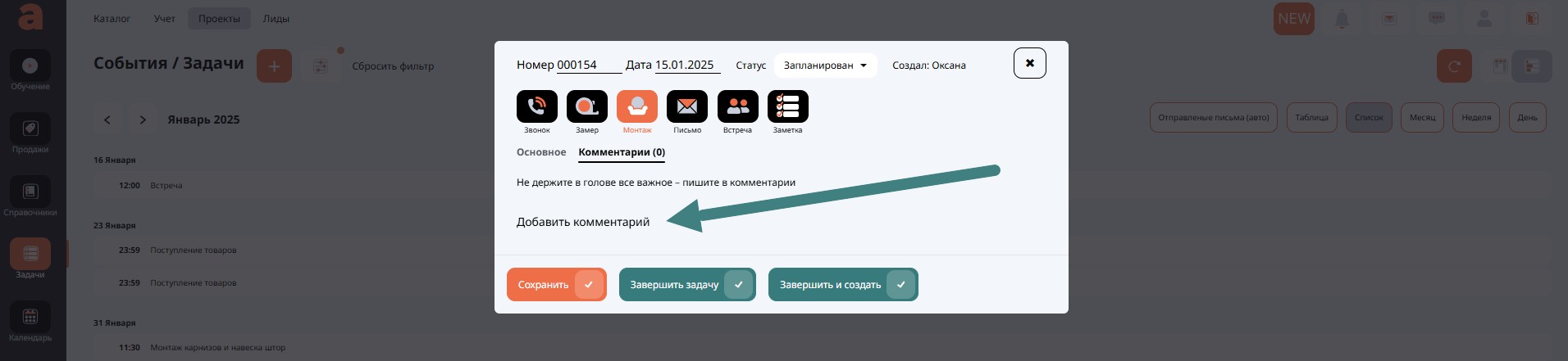 В правой части экрана есть панель, которую при необходимости можно открыть или убрать с экрана. Задачи распределены по видам- позвонить, написать письмо, выехать на замер, монтаж, устроить личную встречу с клиентом. Давайте запланируем монтаж.