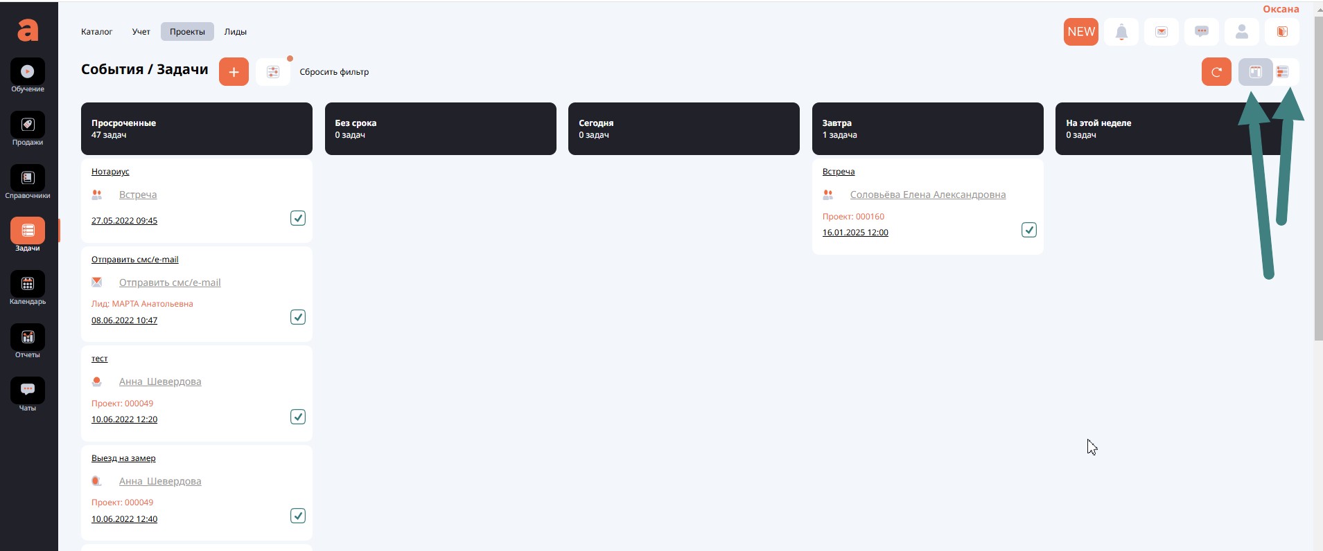 Здесь все задачи распределены по срокам исполнения. Но можно изменить визуальное представление и получить таблицу, список, распределенные события в календаре на месяц, неделю и день.