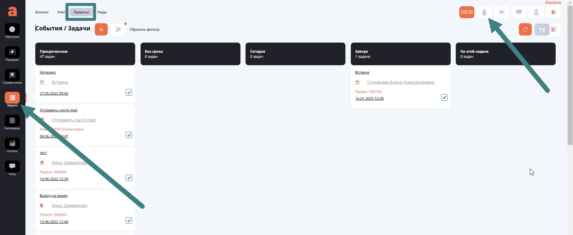 Также можно включить напоминание об этом событии, и выбрать, кому в системе придет это напоминание. Можно выбирать нескольких исполнителей и выбирать несколько временных промежутков для отправки напоминаний. Уведомление о событии сотрудник получит в области уведомлений и при соответствующих настройках на почту. После сохранения задачи ее можно найти на вкладке Проекты - Задачи.