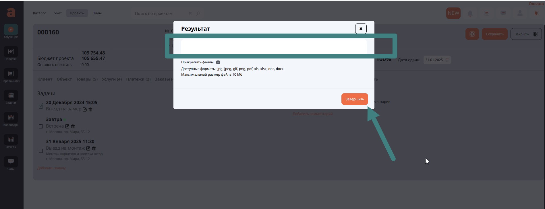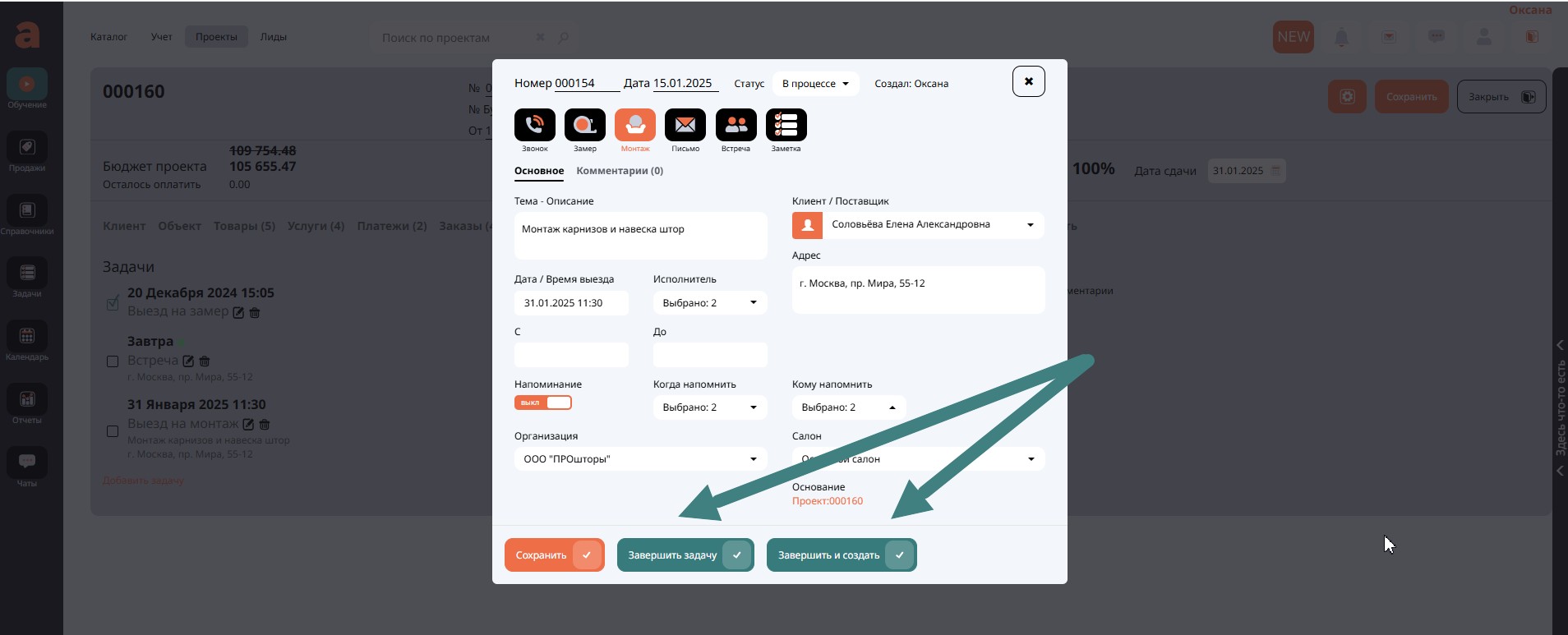 Если мы завершаем выполнение задачи, нажимаем на соответствующую кнопку, появляется окно, куда мы заносим результат, например, "монтаж выполнен". Для завершения задачи предусмотрены две кнопки "Завершить задачу" и "Завершить и создать". Кнопка "Завершить задачу" - фиксирует результат и завершает задачу, а "Завершить и создать" - позволяет после завершения сразу открыть окно для создания новой задачи.