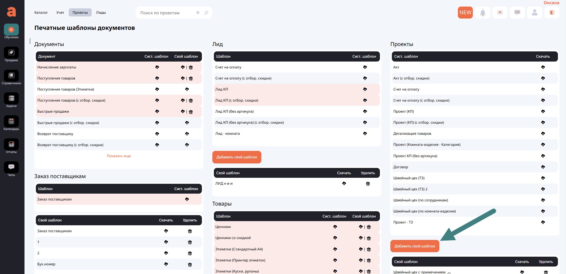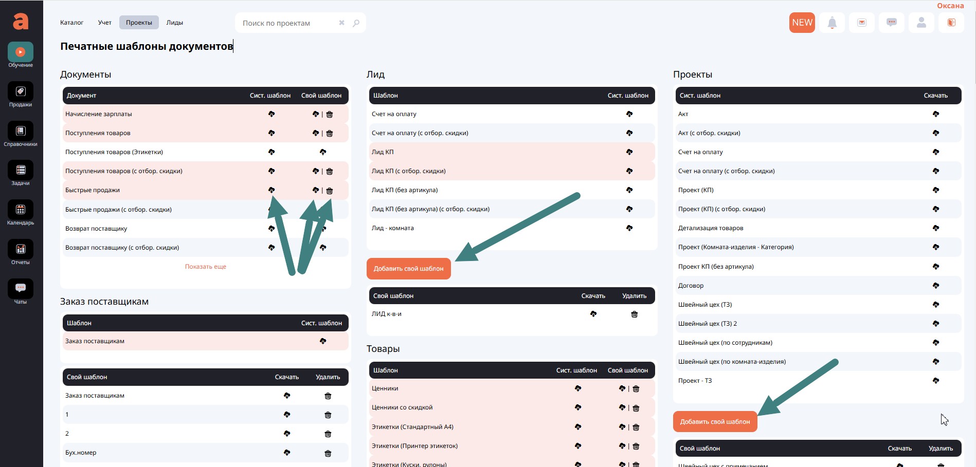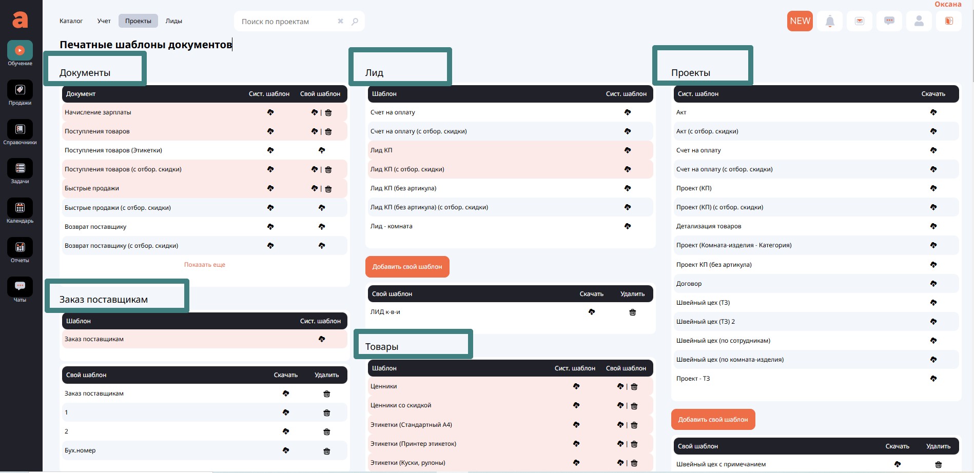 Все шаблоны документов разделены по смыслу - блок Документы - это ваши рабочие документы, начисление зарплаты, поступление товара и т.д. Блок Проекты содержит шаблоны документов - акт выполненных работ, КП, договор, которые предназначены для работы с клиентом. Блок Товары содержит шаблоны ценников и этикеток. Блок Лид - печатные формы для потенциальных клиентов. Блок Заказ поставщикам - все формы, связанные с заказом товара поставщику, бланки заказа.