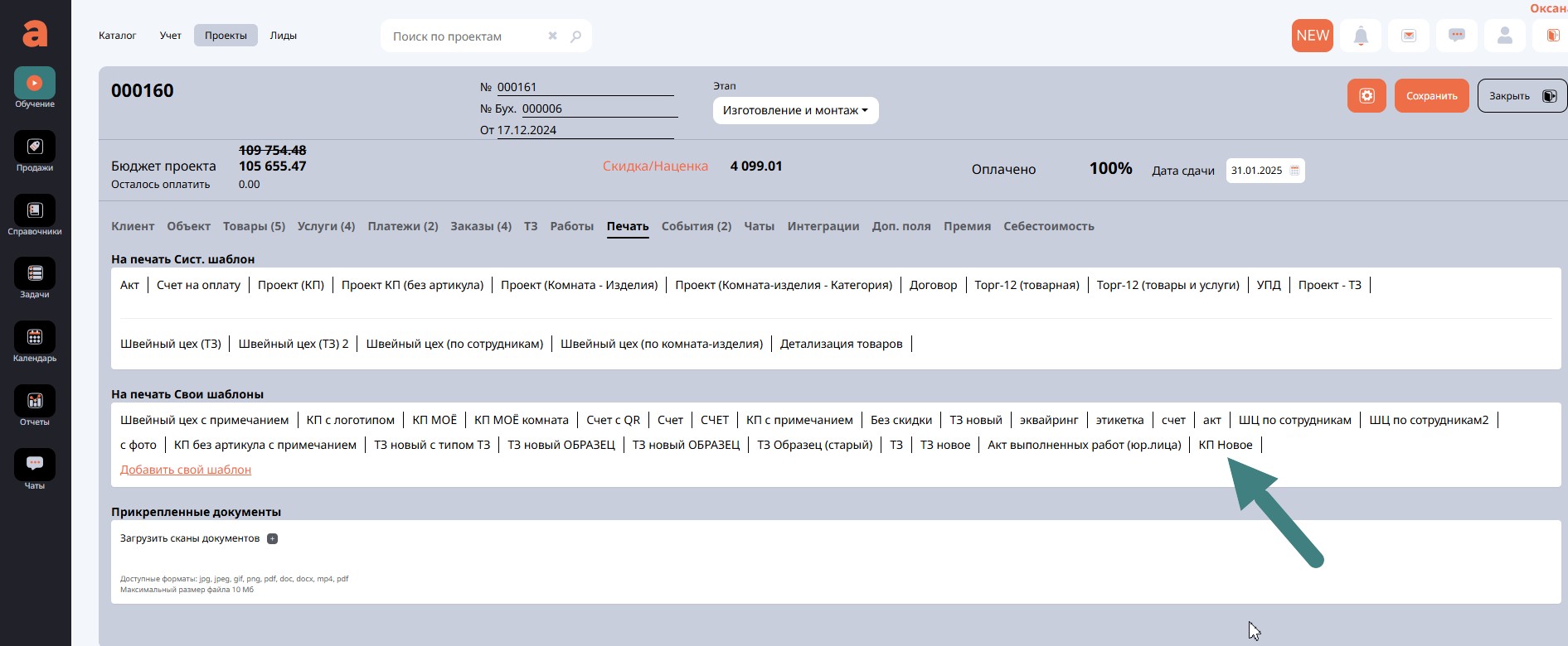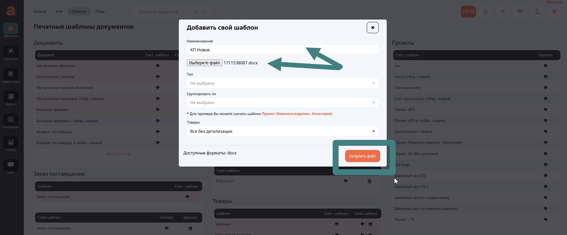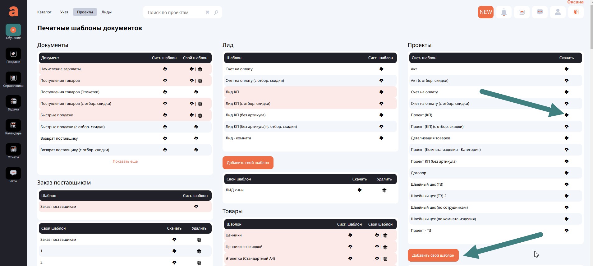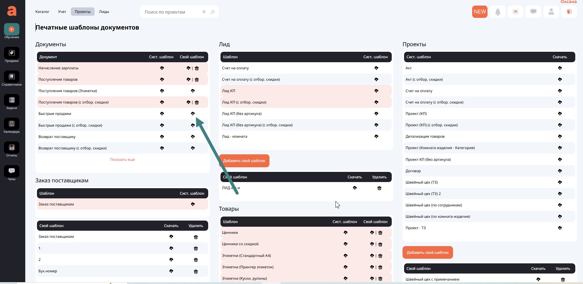 Все шаблоны документов разделены по смыслу - блок Документы - это ваши рабочие документы, начисление зарплаты, поступление товара и т.д. Блок Проекты содержит шаблоны документов - акт выполненных работ, КП, договор, которые предназначены для работы с клиентом. Блок Товары содержит шаблоны ценников и этикеток. Блок Лид - печатные формы для потенциальных клиентов. Блок Заказ поставщикам - все формы, связанные с заказом товара поставщику, бланки заказа.