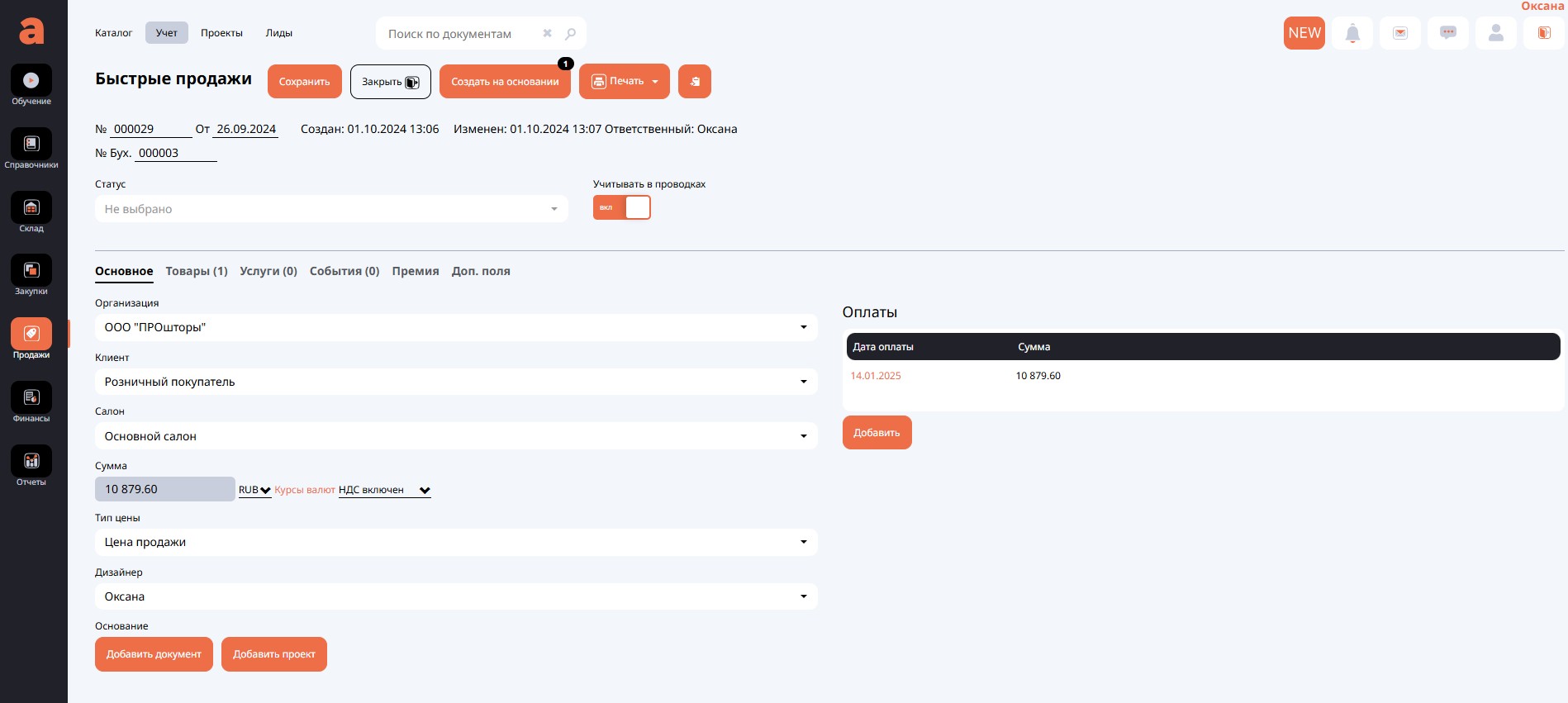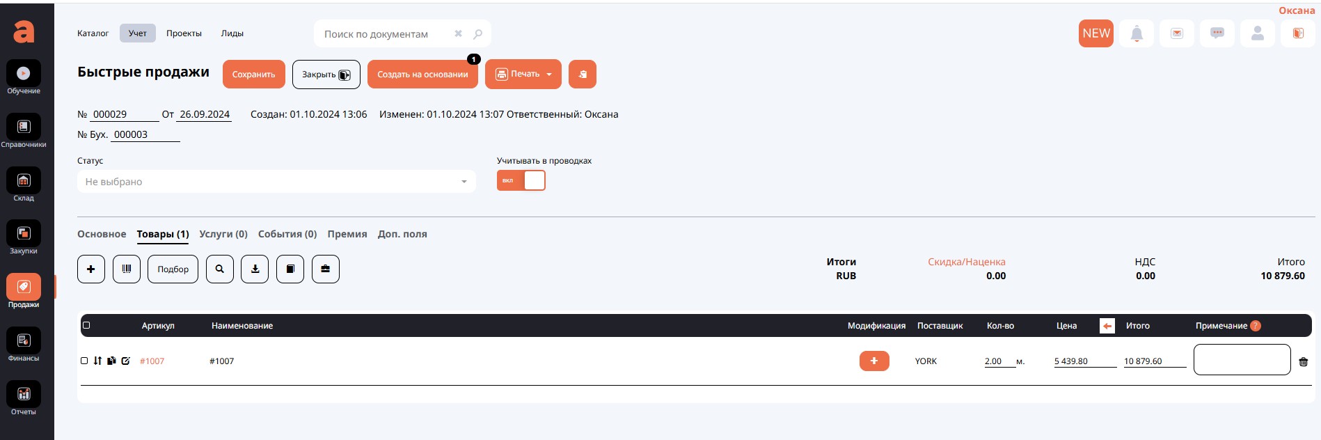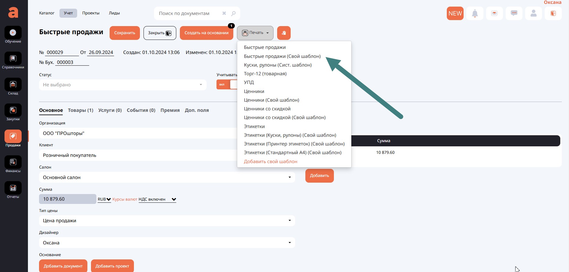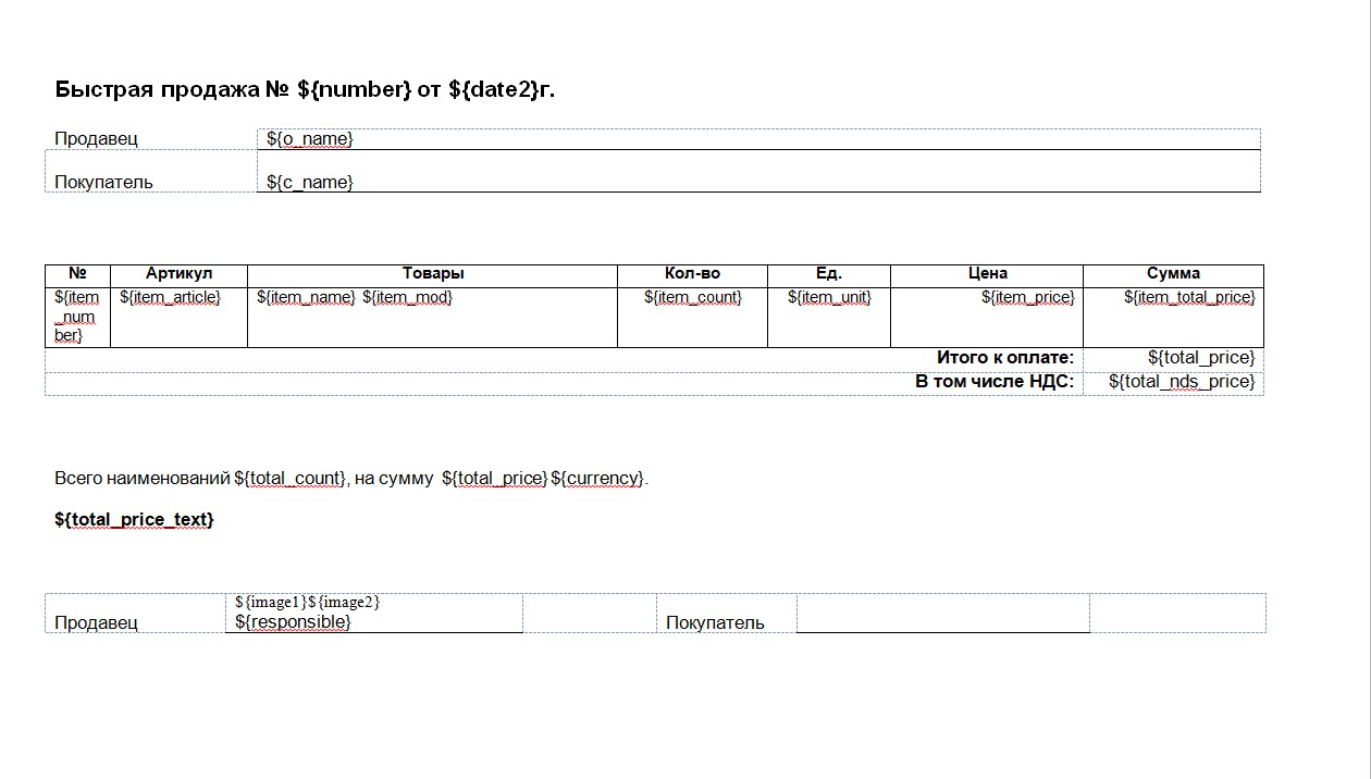 Рассмотрим системный шаблон и как его отредактировать на примере документа Быстрые продажи.