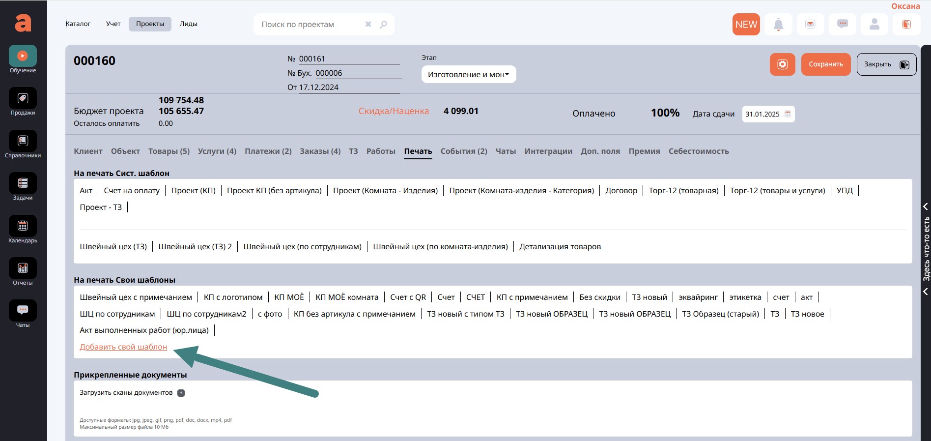 Для работы с печатными формами мы должны зайти в любой созданный проект, а если проектов еще нет, то создать его. Нас интересует в данный момент вкладка Печать. На этой странице проекта мы видим три блока - На печать системные шаблоны, Свои шаблоны, и Прикрепленные документы.