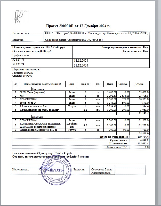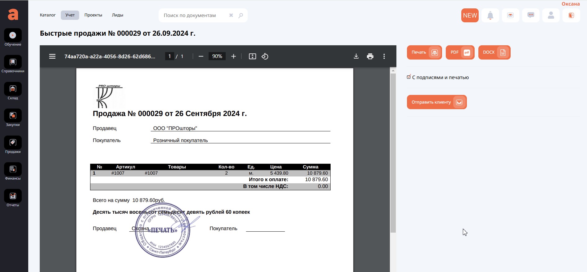 Полученный документ коммерческого предложения можно распечатать, скачать в формате PDF и docx (MSWord), установить настройку, которая позволяет формировать документ с подписью и печатью, отправить документ на почту клиенту.