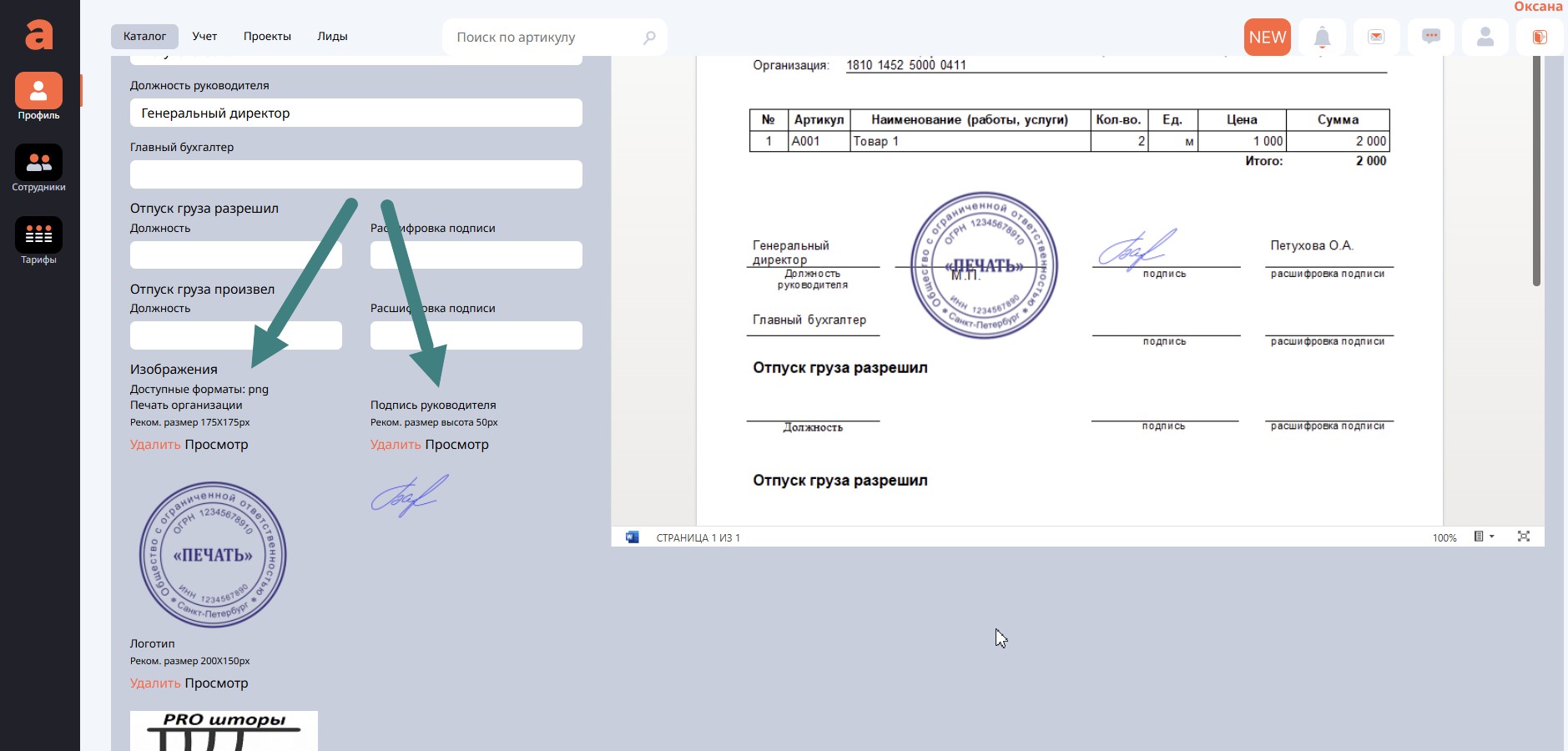 Что мы можем сделать с этой печатной формой? Распечатать, скачать в формате PDF и docx (MSWord), установить настройку, которая позволяет формировать документ с подписью и печатью. Для этого необходимо до формирования документа в профиле, на вкладке Юридические данные загрузить скрины подписи и печати.