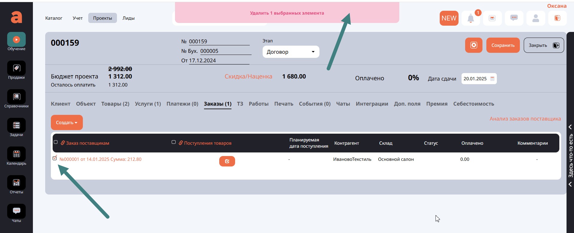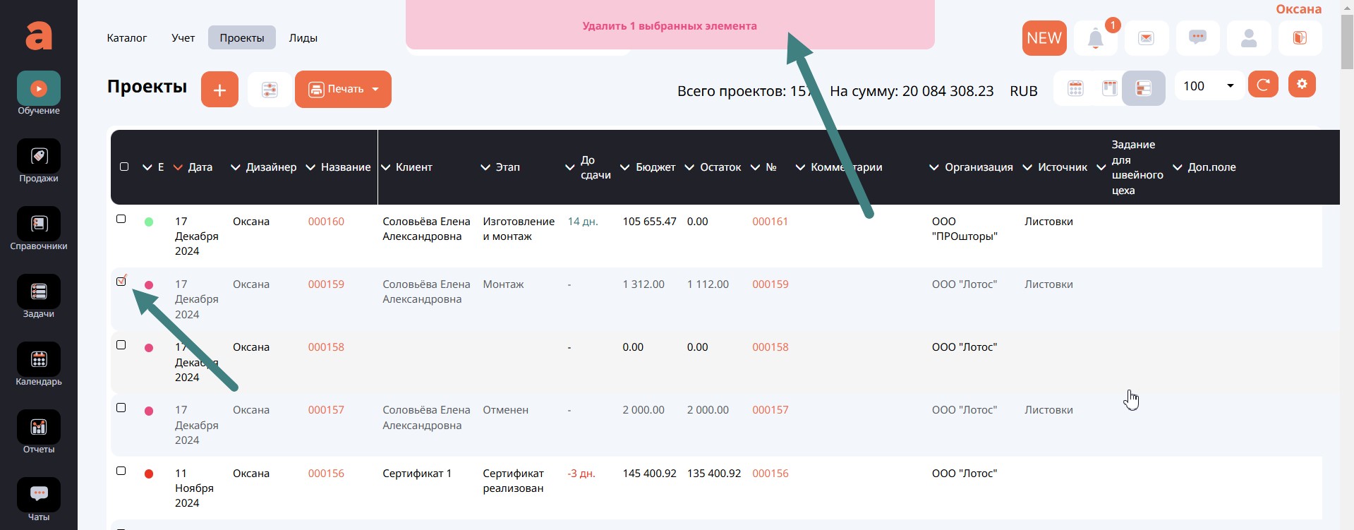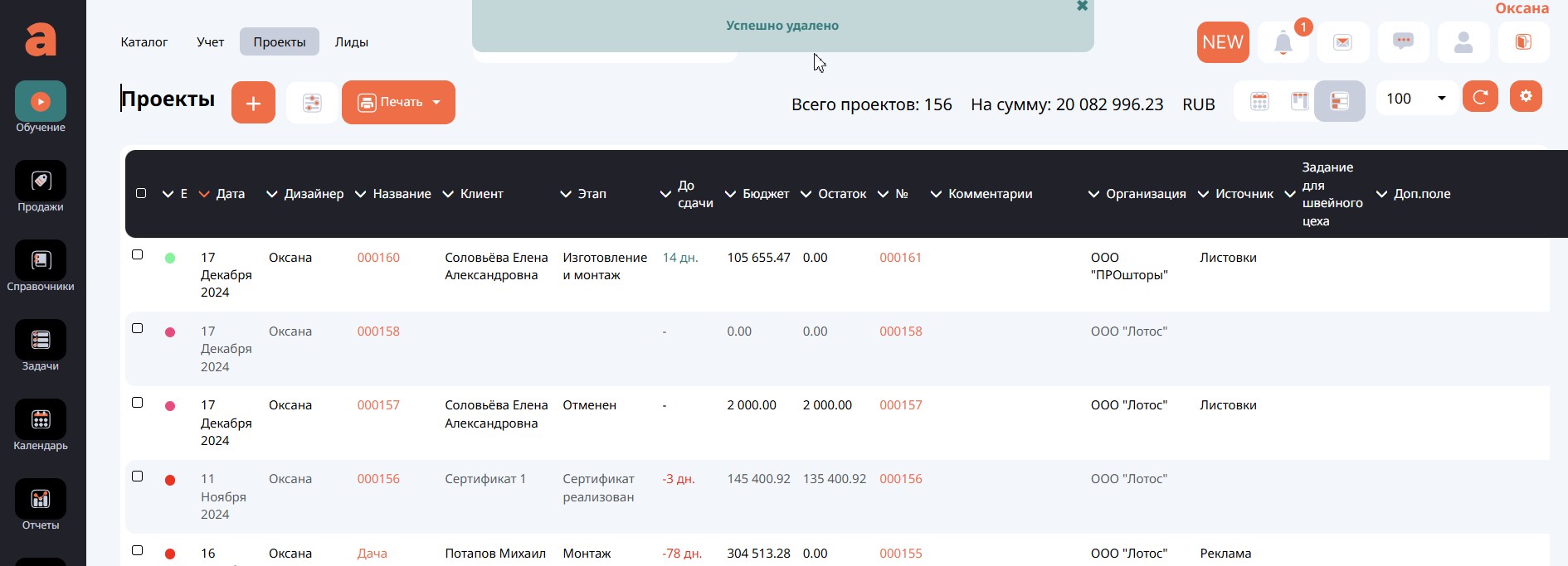 Когда все связанные документы удалены, можно перейти к удалению самого Проекта, отметить его галочкой и удалить. Об успешном удалении свидетельствует соответствующее сообщение в верхней части экрана.