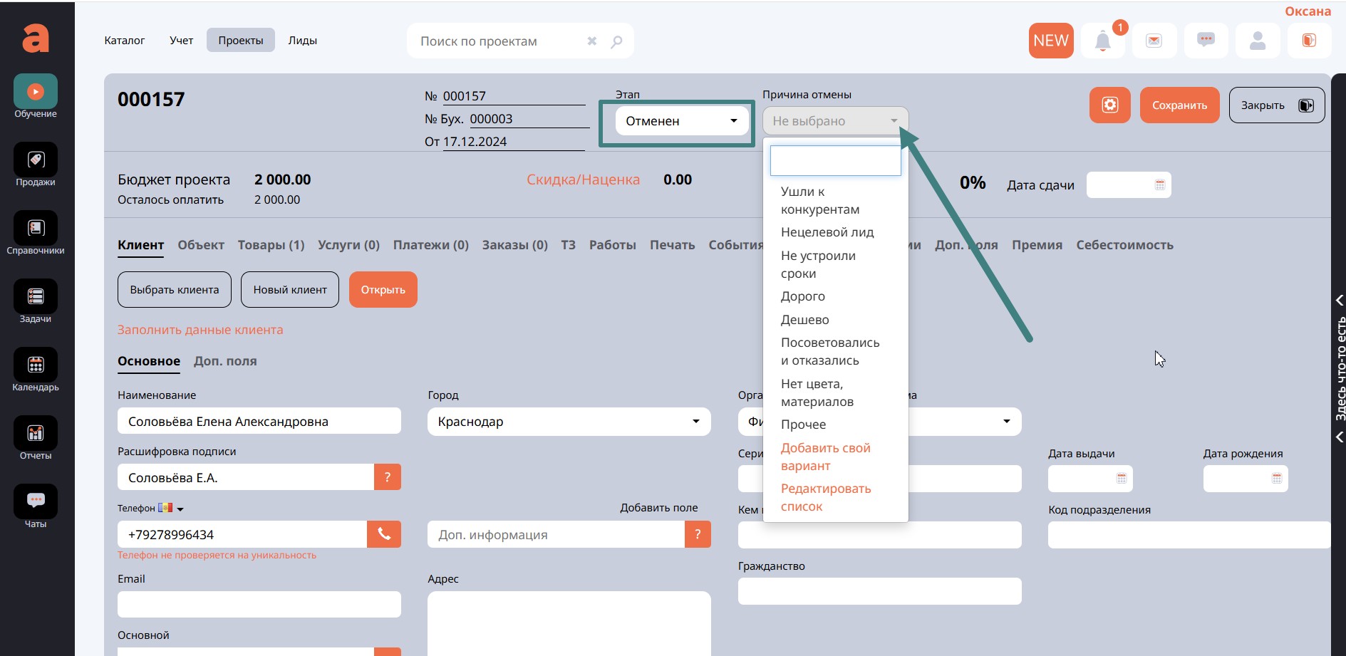 Если на любом из этапов выполнения проекта клиент отказался от заказа, переводим проект на этап Отменен, появляется еще одно поле Причина отказа. Если в списке причин вашей причины нет, можете добавить свой вариант.