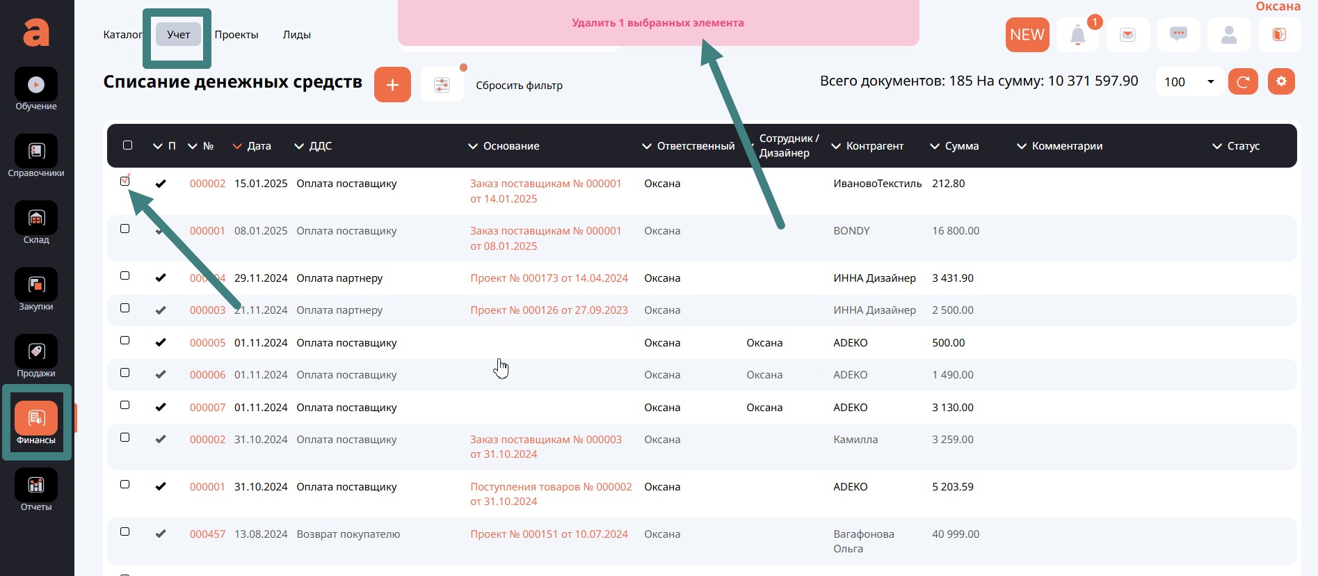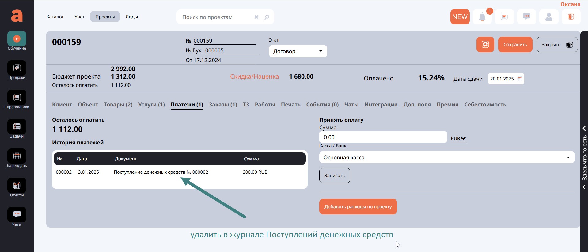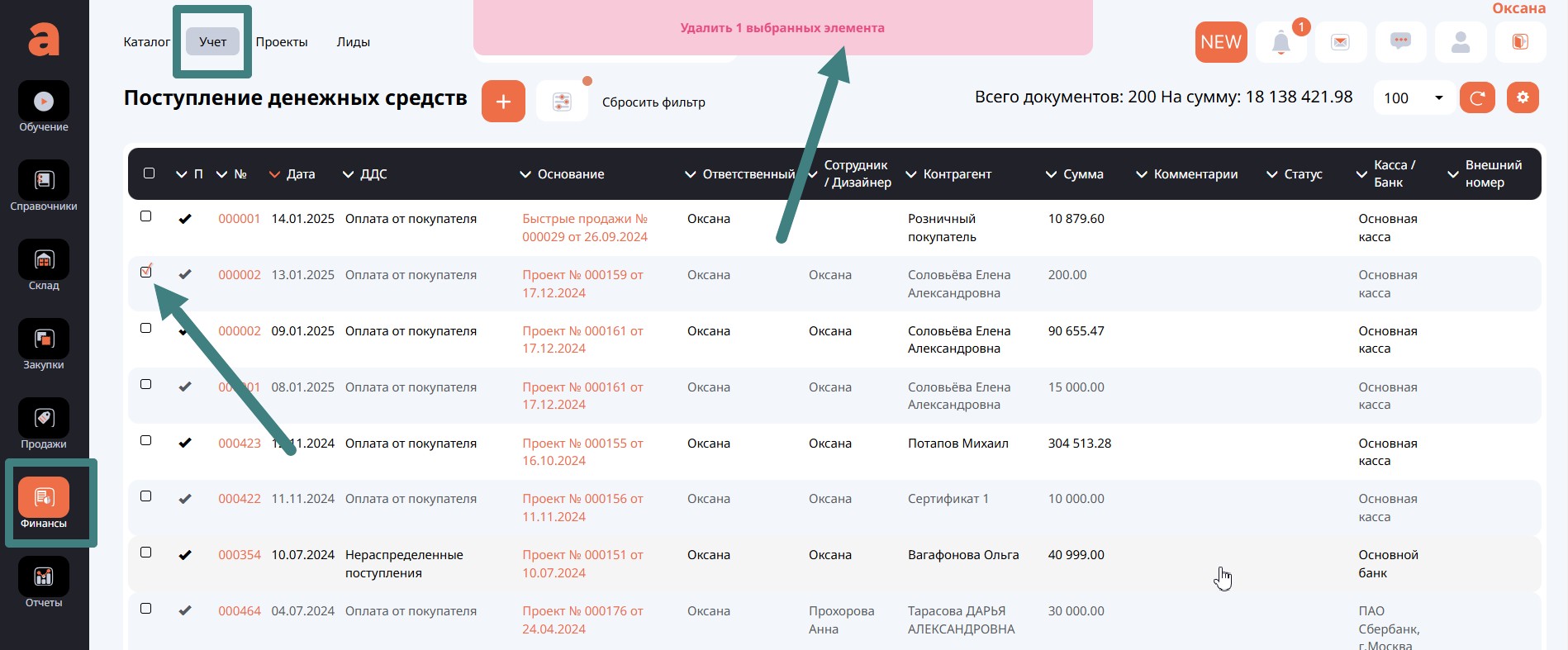 Далее на вкладке Платежи отметить для себя документы оплаты от клиента, перейти в разделе Учет на вкладке Финансы в журнал Поступление денежных средств и удалить их.